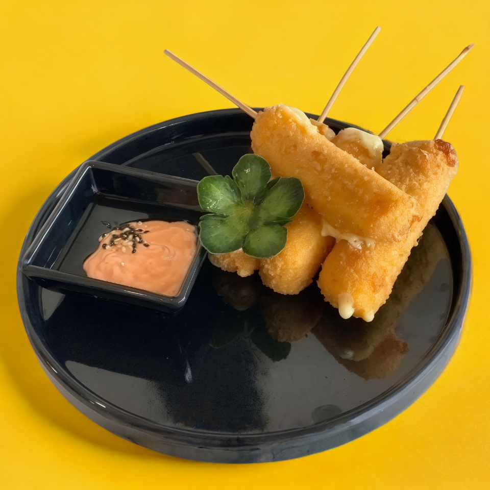 Relleno de queso crema, aguacate, camarón, arrachera, pollo y cangrejo, cubierto de queso fundido, empanizado, cubierto de tampico, con pedacitos de camarón empanizado y bañados en salsa de anguila y chipotle.