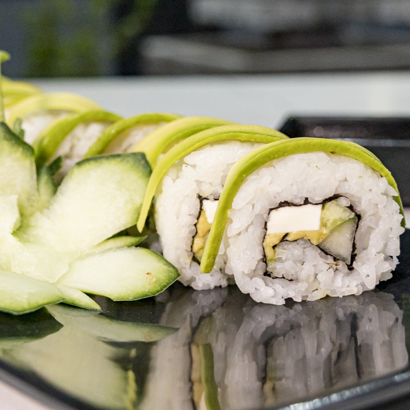 Relleno: pepino aguacate y queso crema, proteína a la elección (camarón, cangrejo, pulpo) cubierto: por alga, arroz y aguacate.
