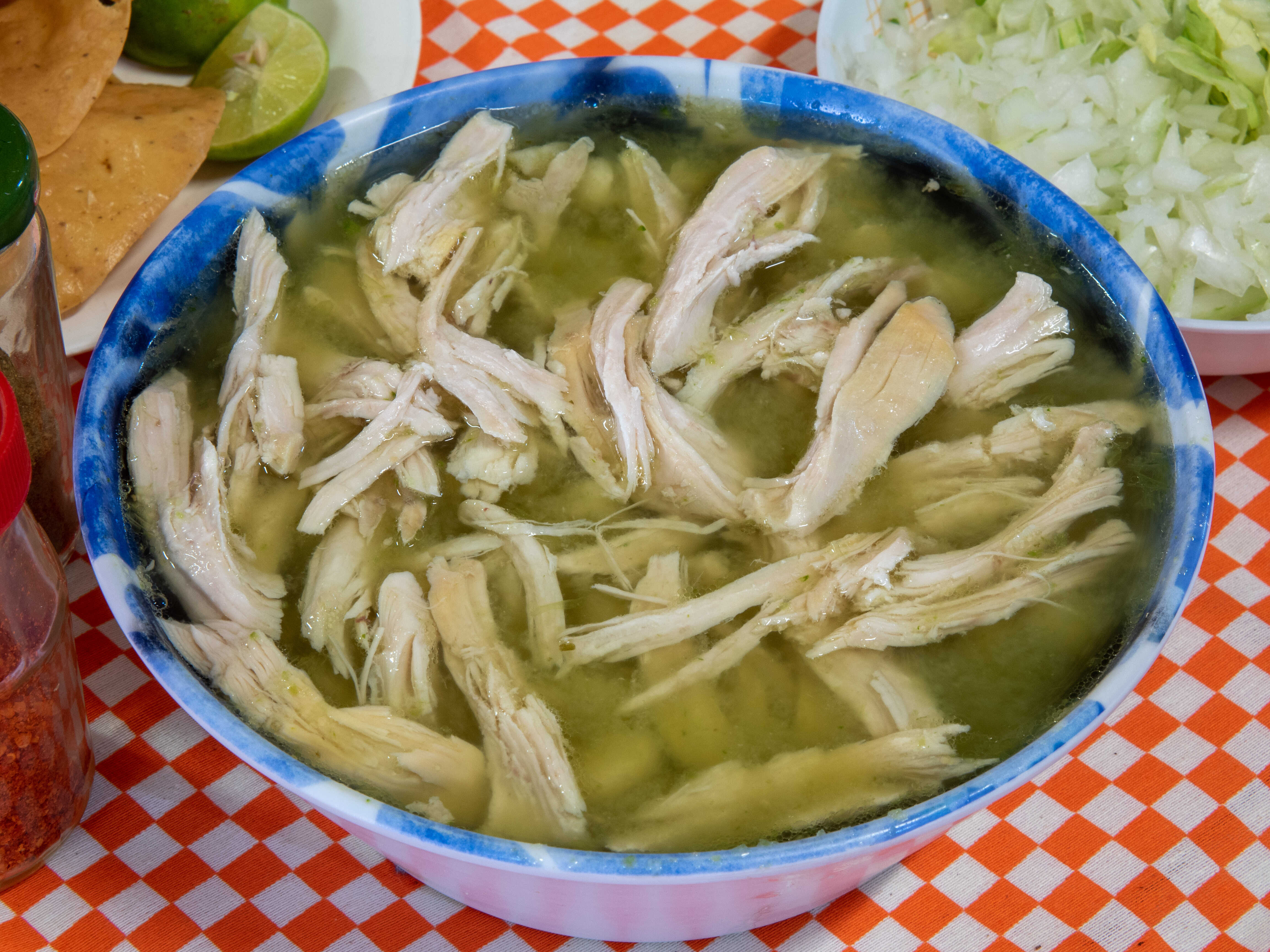 Pozole, maíz, pechuga de pollo, (ensalada de verdura, tostadas, chile en polvo y orégano incluidos).