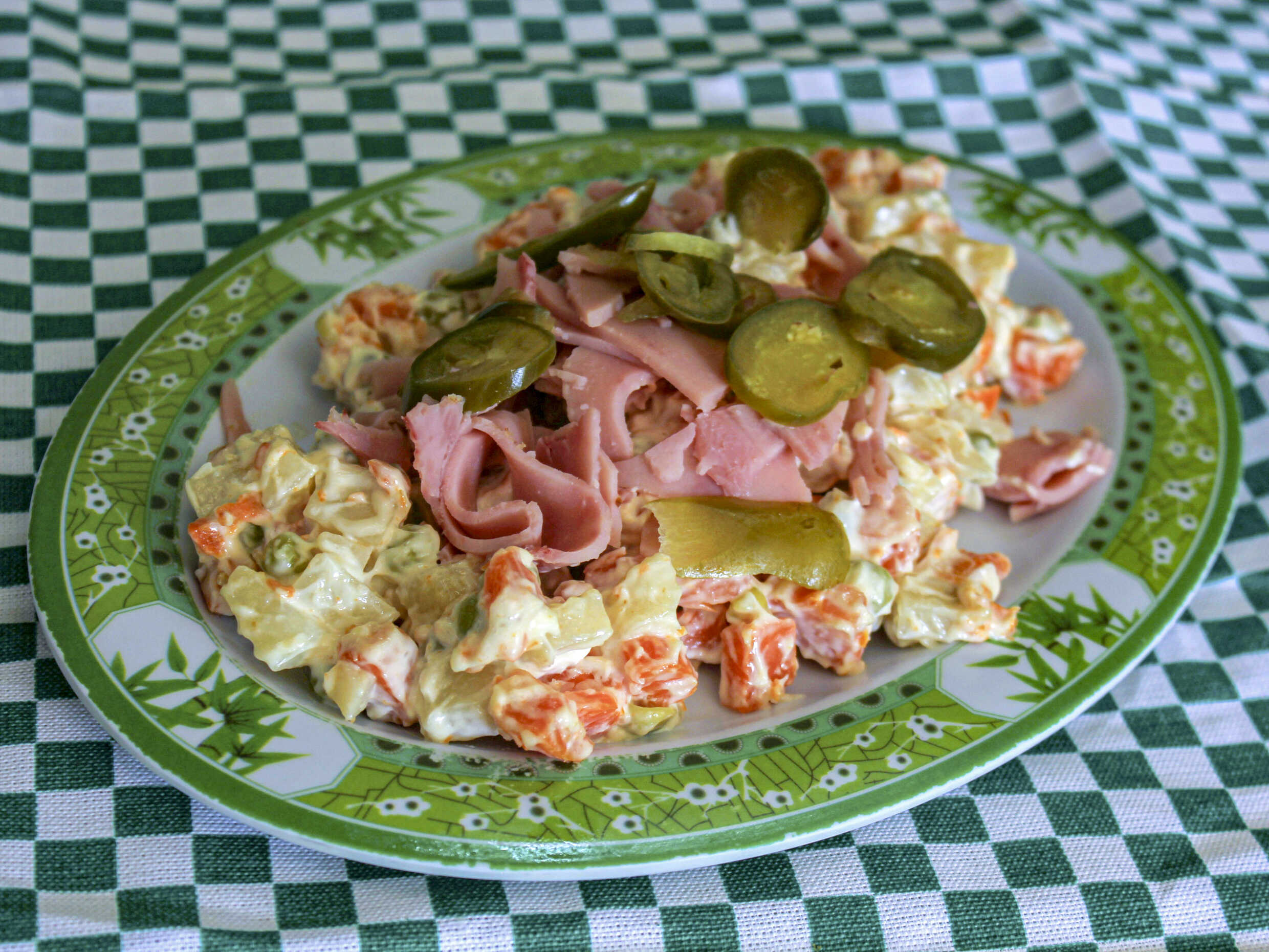 Ensalada de verduras cocinas (chícharo, papa y zanahoria) con mayonesa y jalapeños. Incluye tostadas.