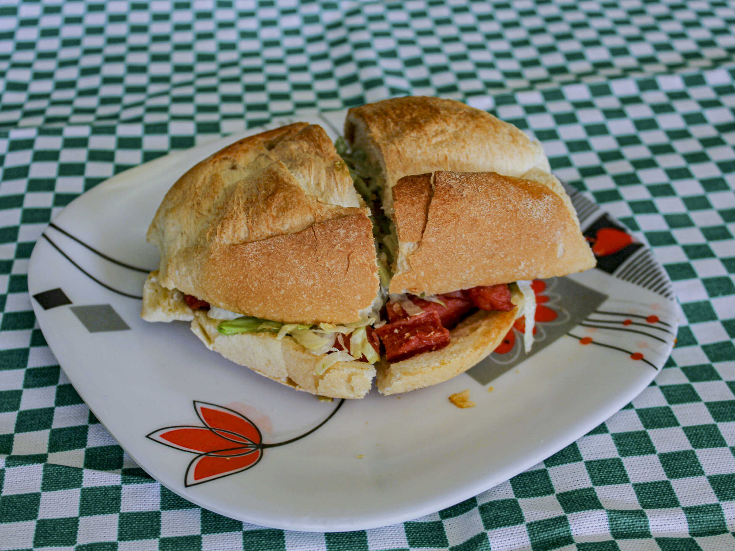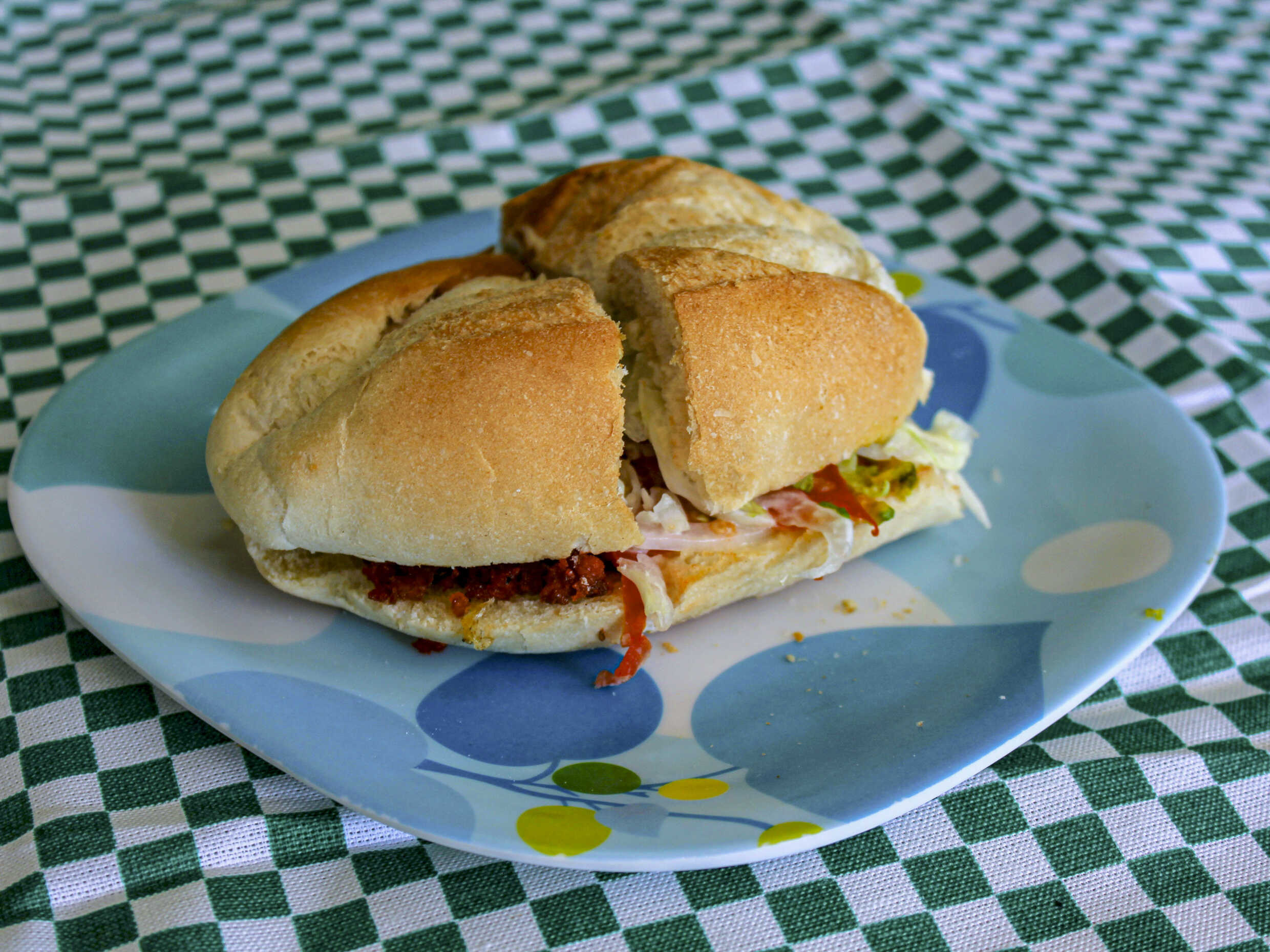 2 Rebanadas de jamón de pavo, lechuga, jitomate y cebolla. Incluye crema, salsas y se entregan por aparte.