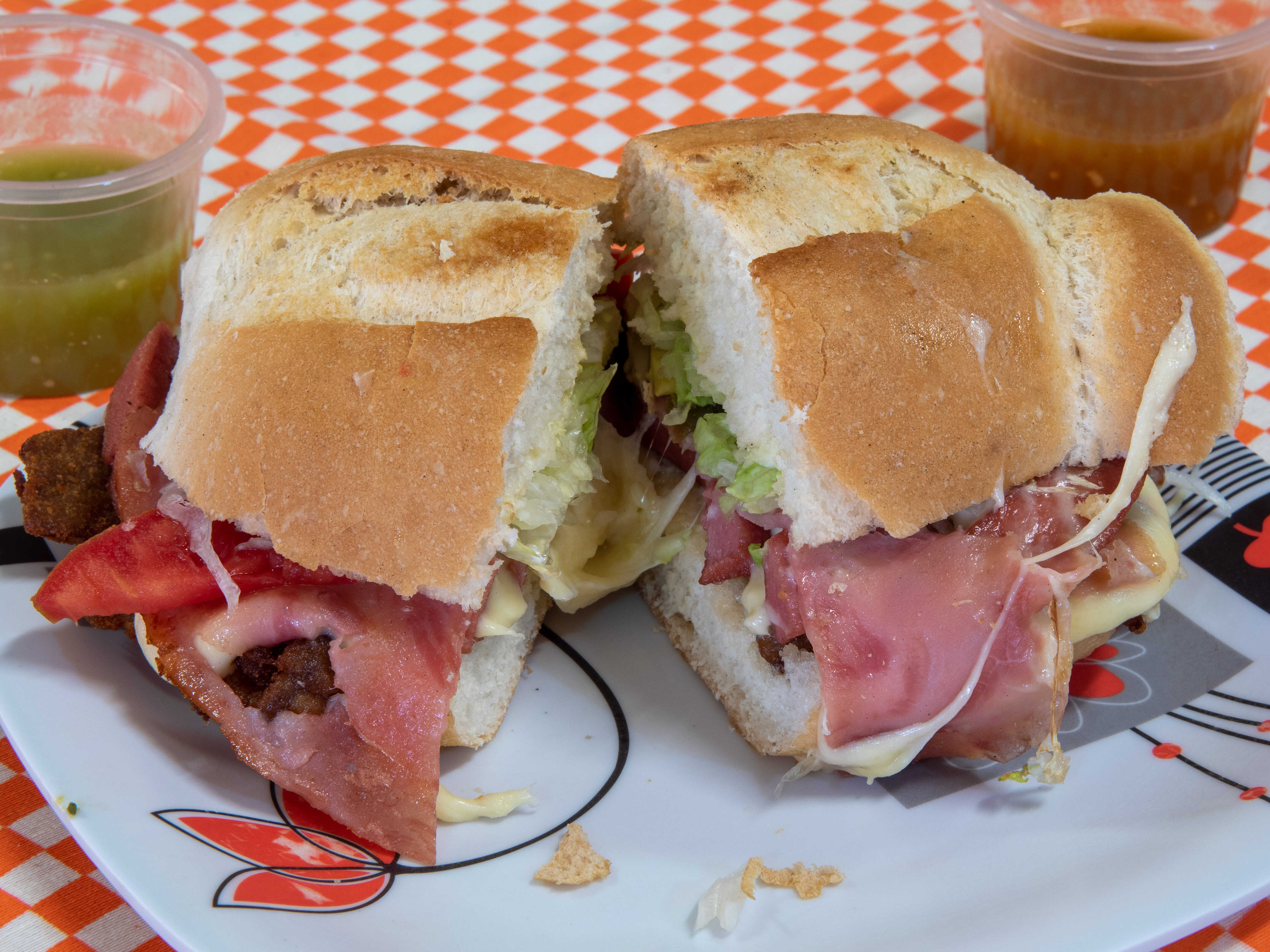 Jamón, queso asadero, lechuga, jitomate, cebolla, cátsup, crema, mostaza y aguacate aderezos incluidos se entregan por aparte.