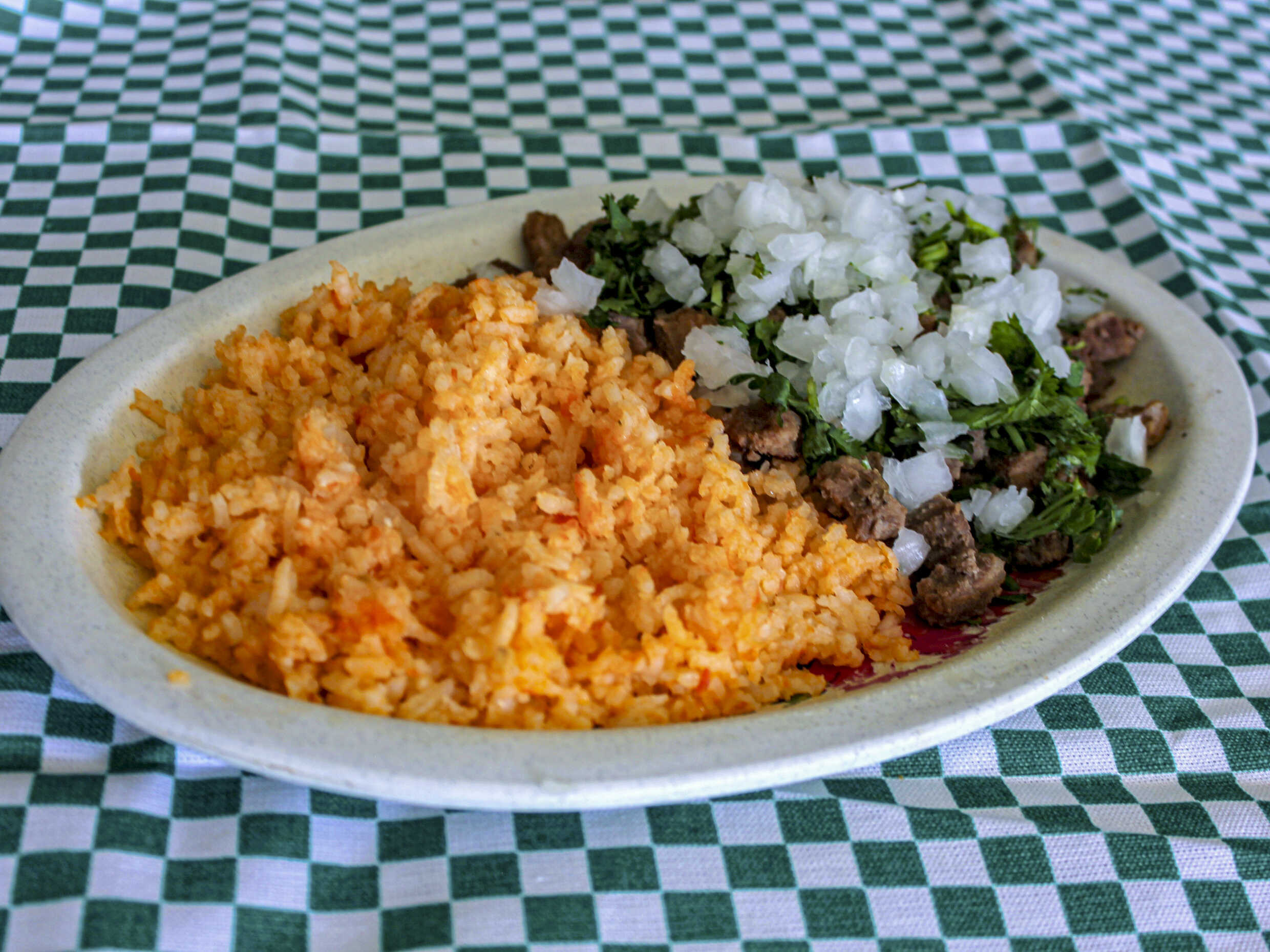 Sopa de arroz, suadero, salsas, cilantro, cebolla y tortillas.