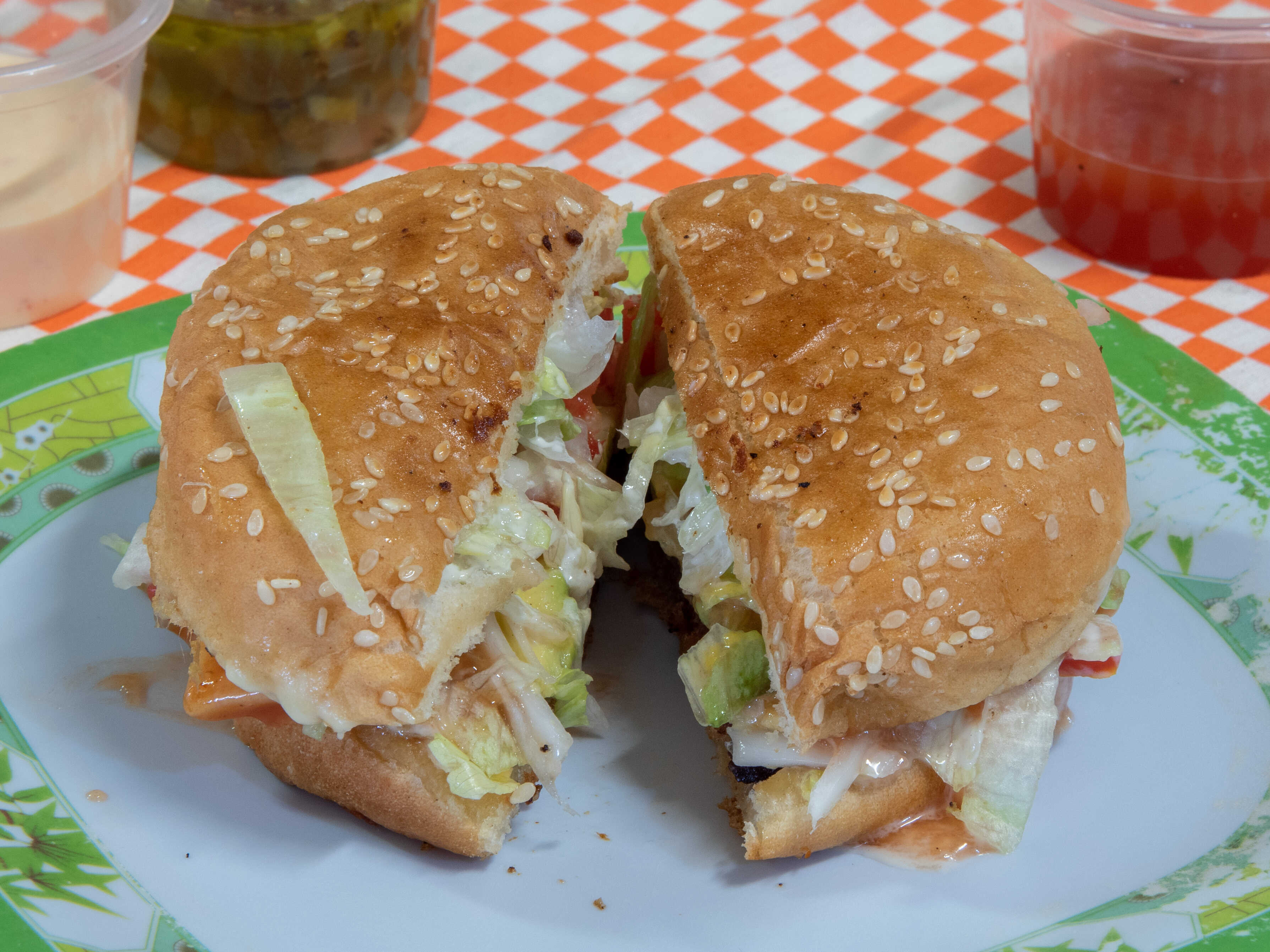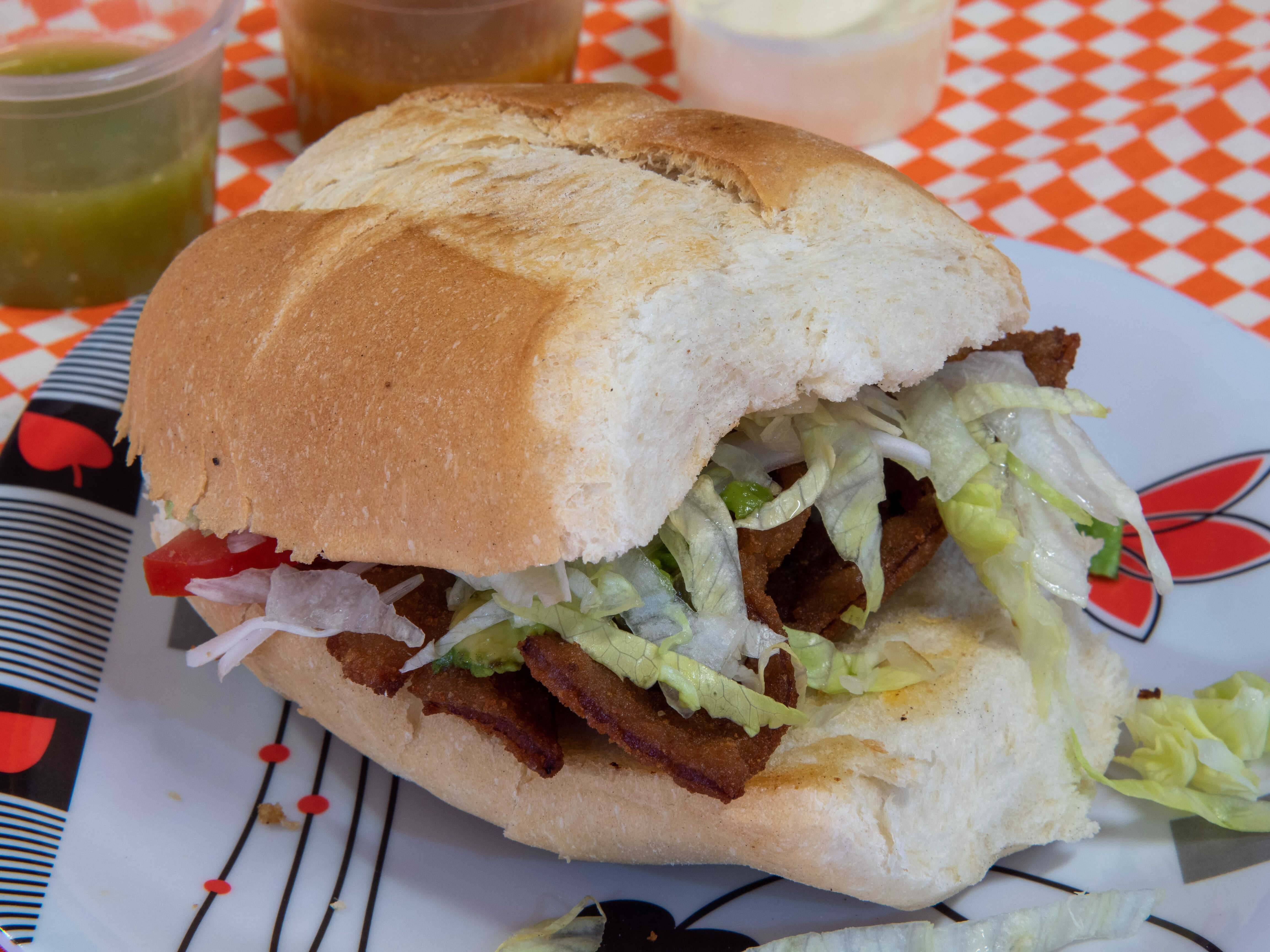 Milanesa de res, lechuga, jitomate, cebolla, salsa y crema.