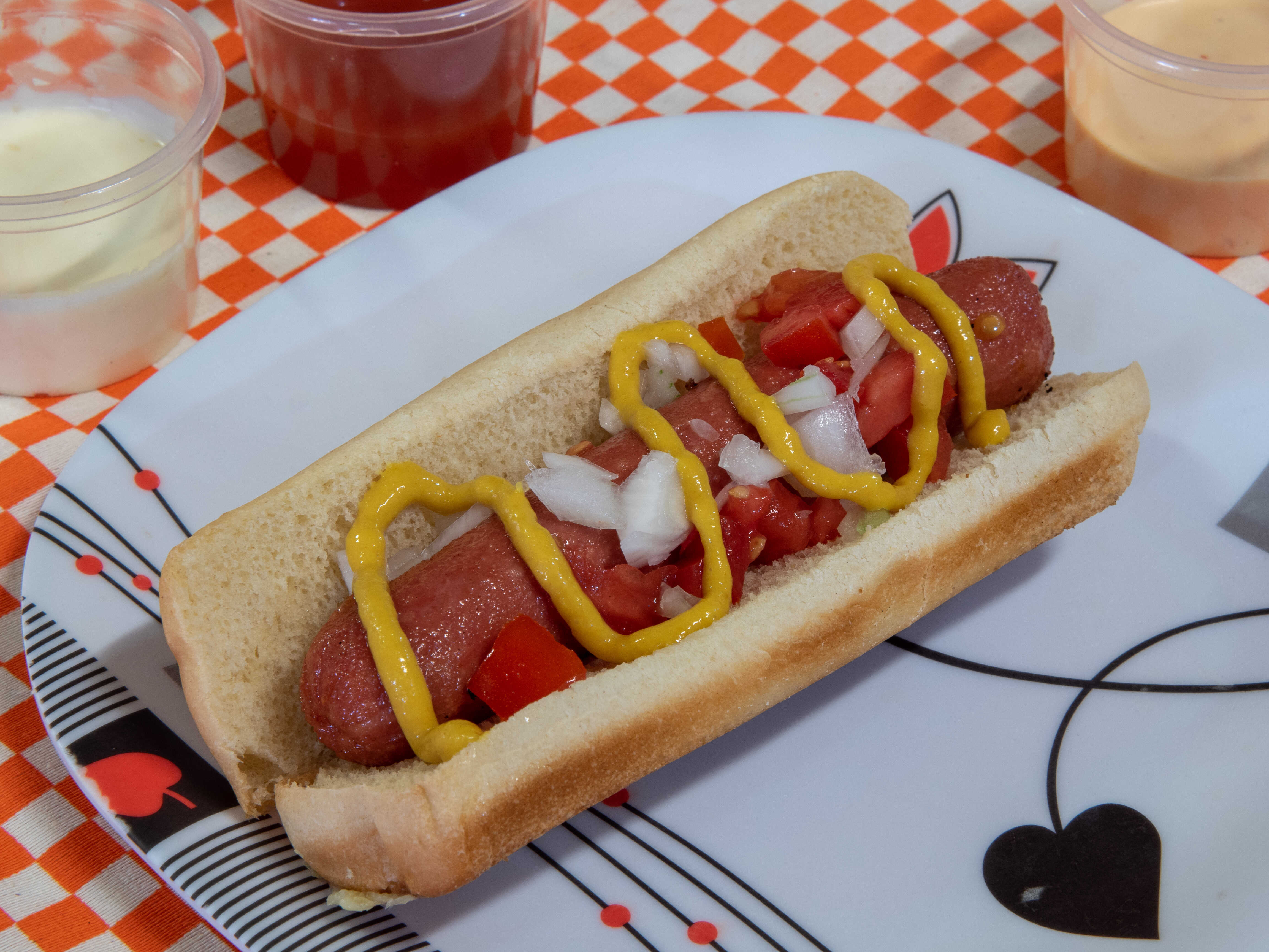 Salchicha, jitomate, cebolla, cátsup, mostaza, crema, mayonesa y jalapeños.