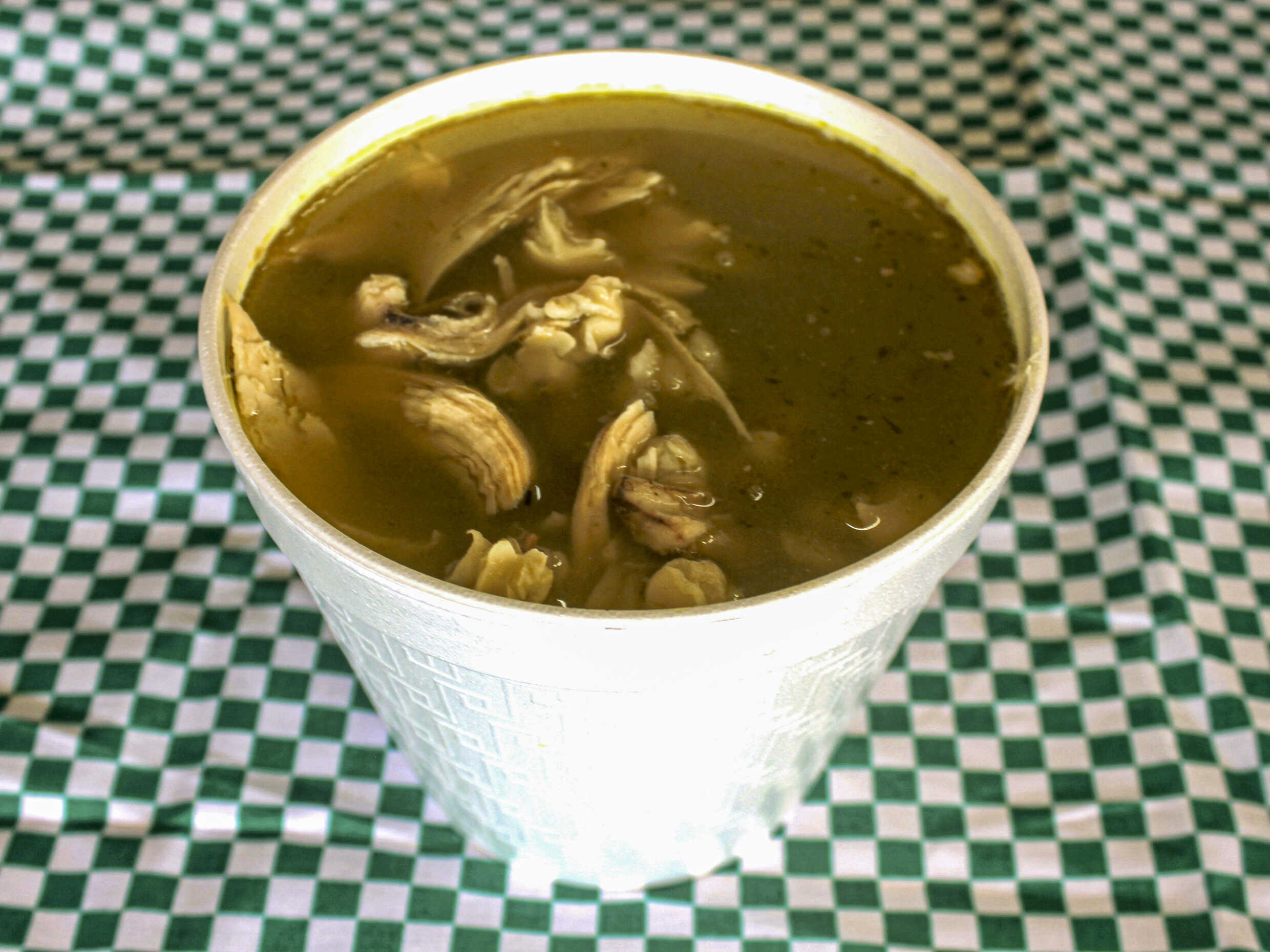 Caldo con una pieza de pollo, verdura cocida, sopa de arroz, tortillas y salsa chipotle.