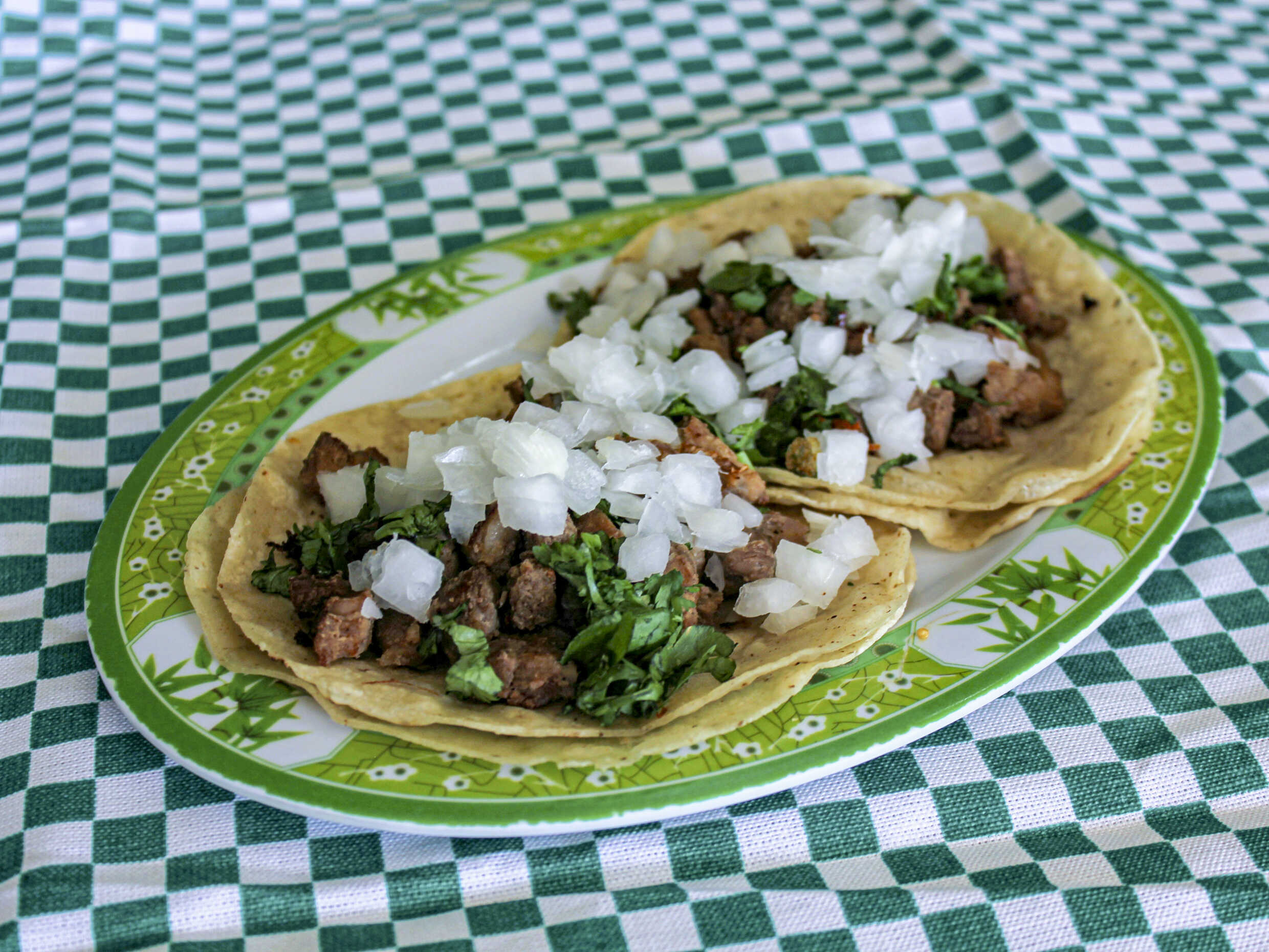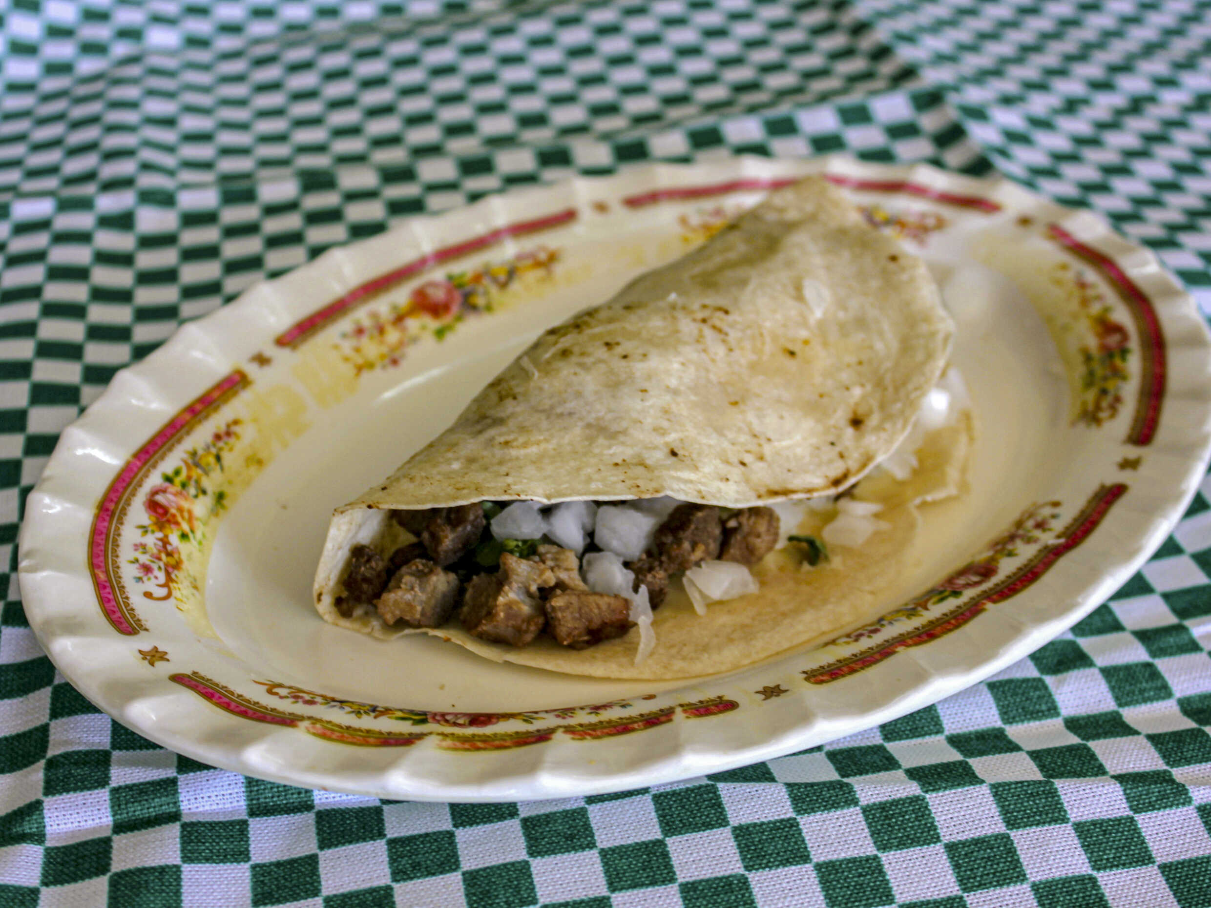 Tortilla de harina, suadero, cilantro, cebolla y salsas.