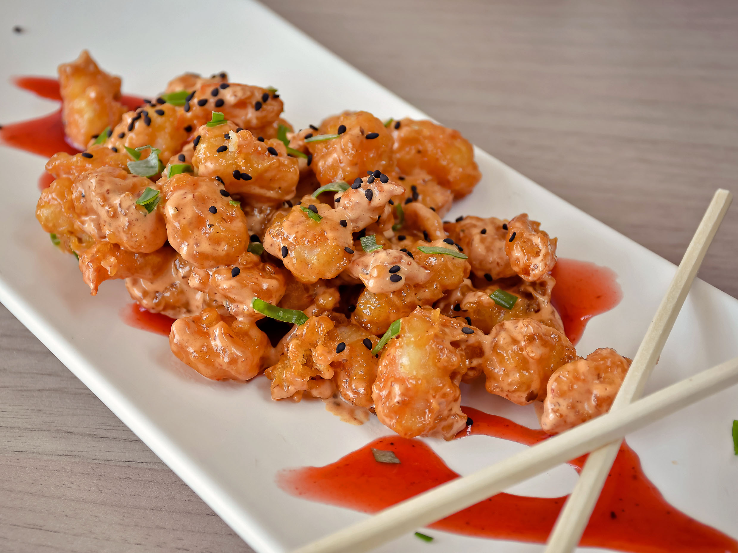Crujientes bites de camarón con un toque de chipotle, chamoy, ajonjolí negro y cebollín