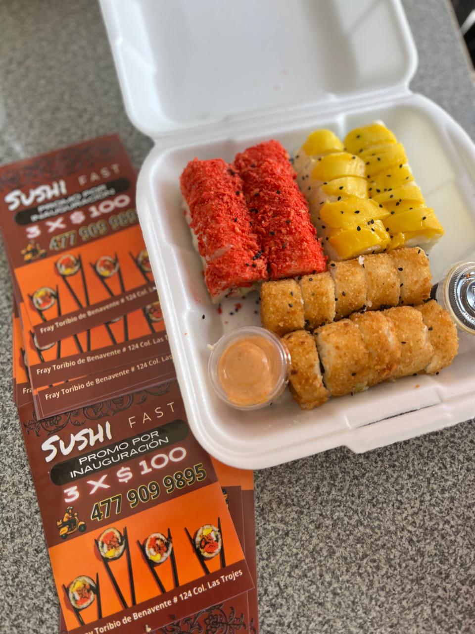 Tres rollos de sushi, arroz, alga, queso Philadelphia, aguacate, pepino y proteína de tu elección por rollo.