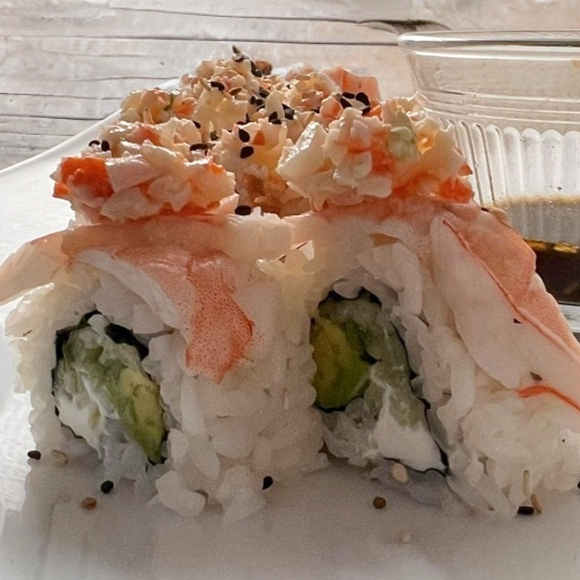 Rollo relleno de aguacate y pepino, forrado con queso crema y camaron, con toping de ensalada tampico
