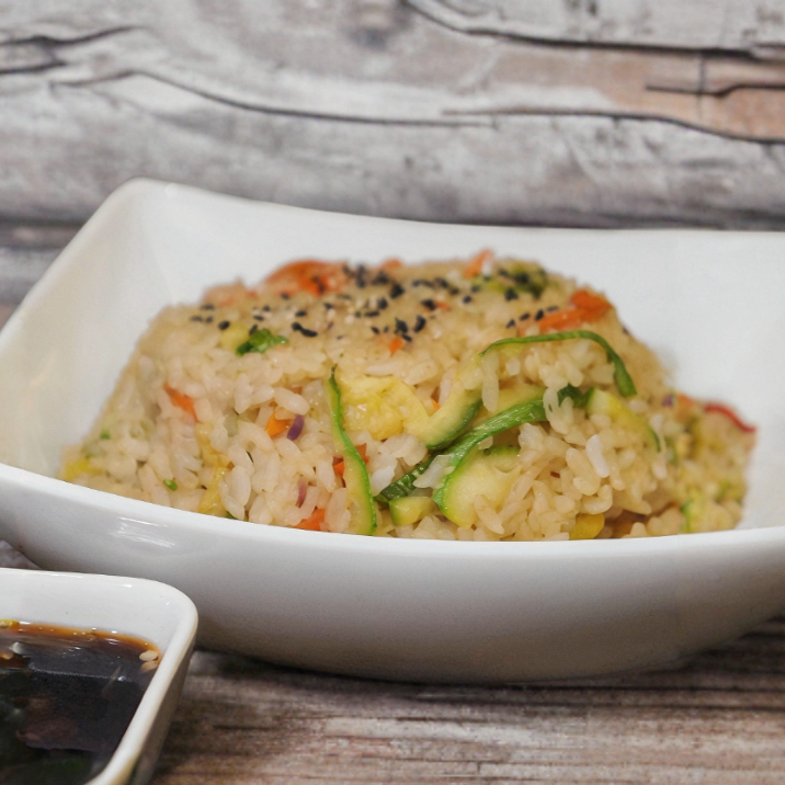 Arroz frito con verdura; zanahoria, Calabaza, cebolla, apio y repollo. acompañado de la proteina a eleccion.