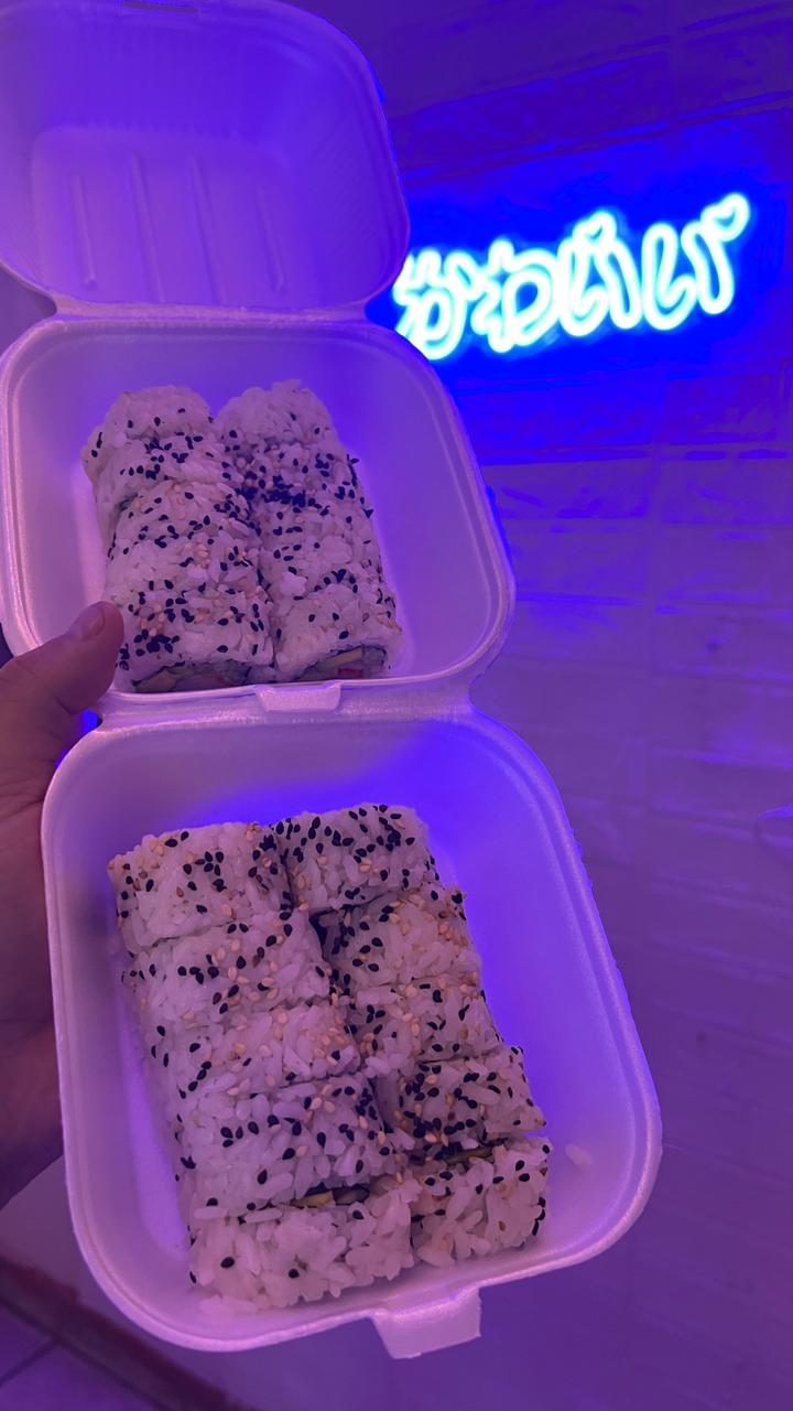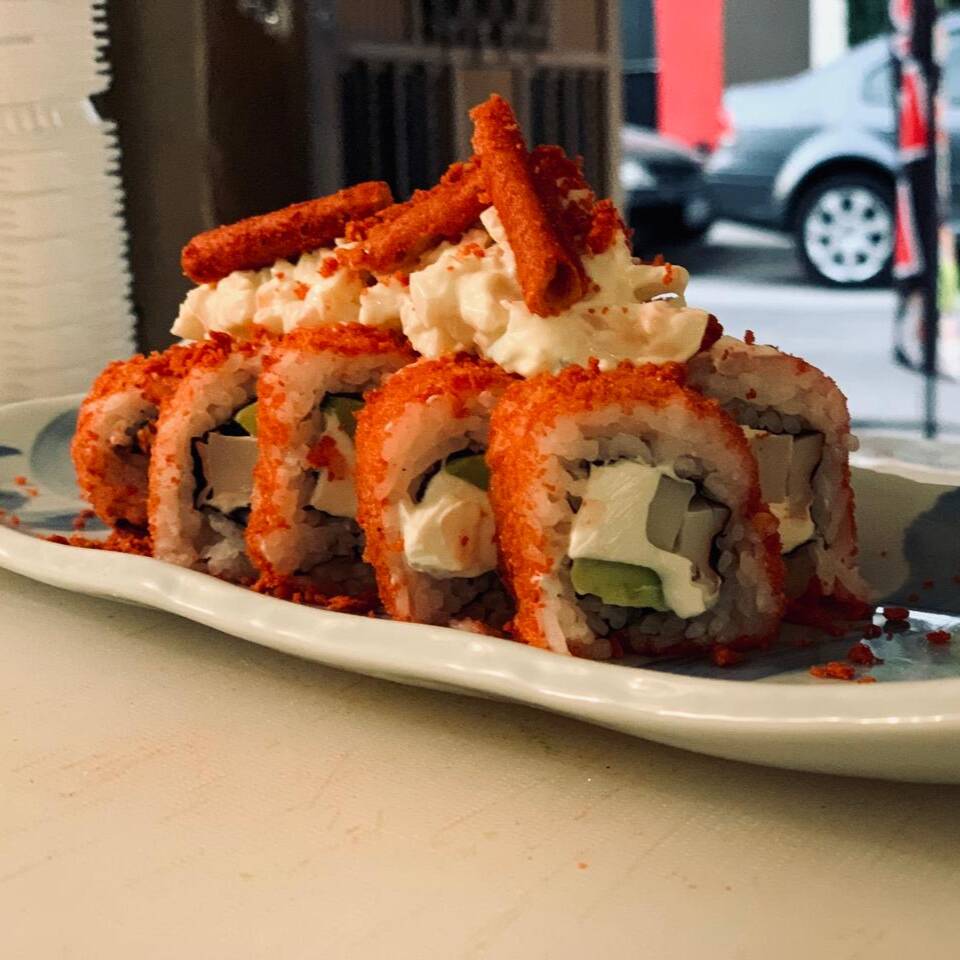 Rollo relleno de aguacate, queso crema y surimi. espolvoreado de cheetos flamonHot y toping de ensalada tampico