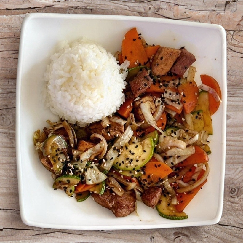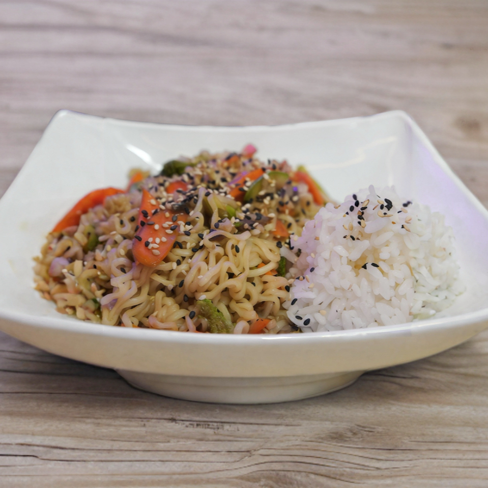Fideos y verdura a la plancha, acompañada con la proteina aleccion y arroz al vapor (Gohan)