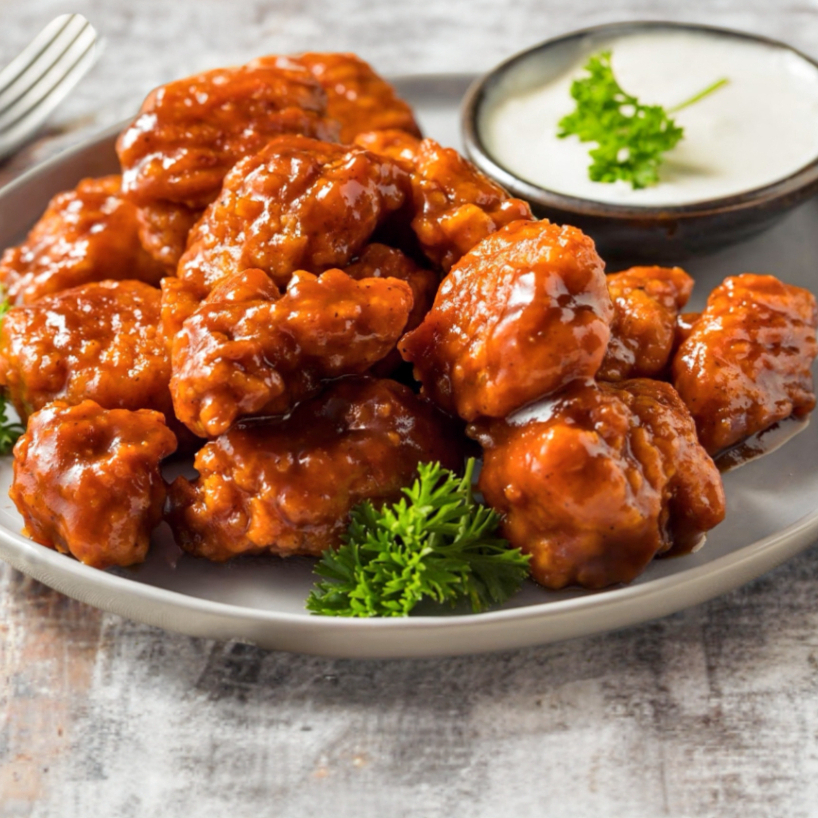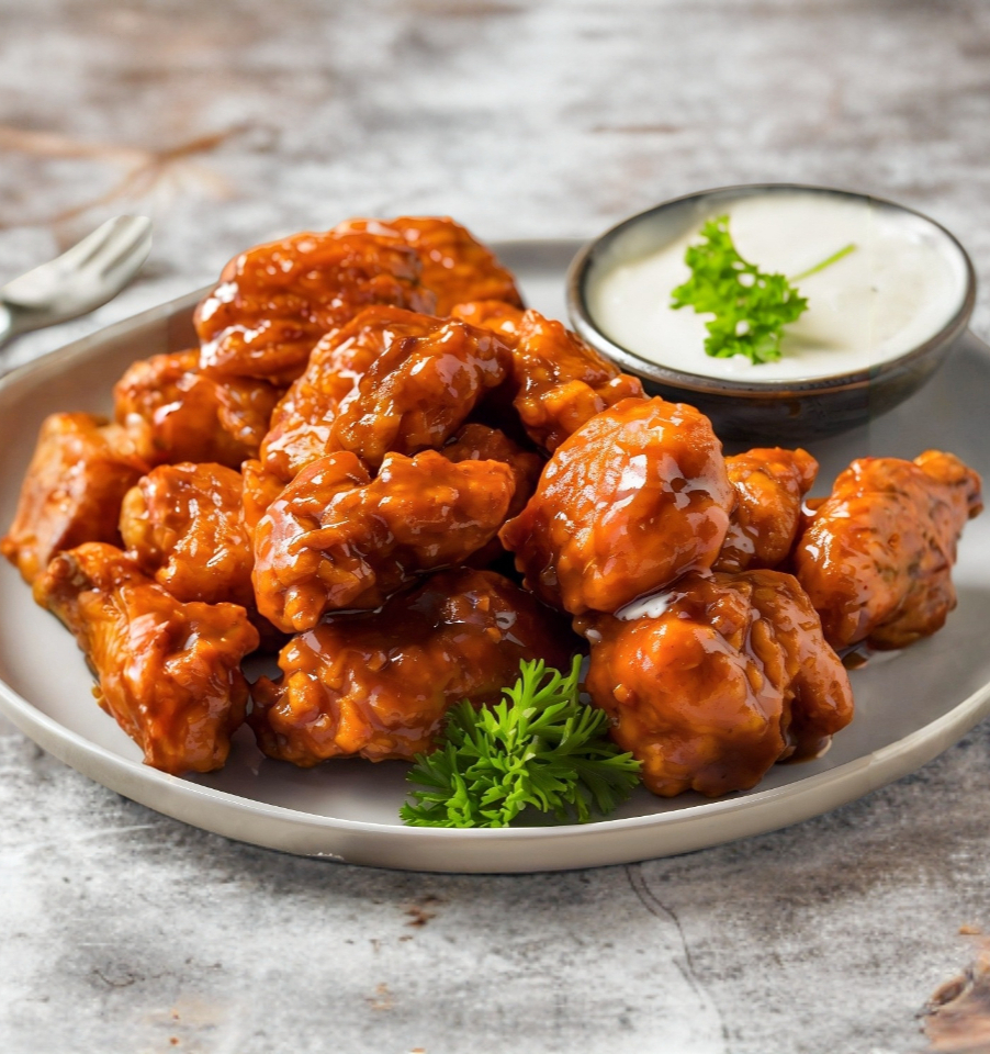 Alas o trozos de pollo fritas bañadas en salsas de la casa
