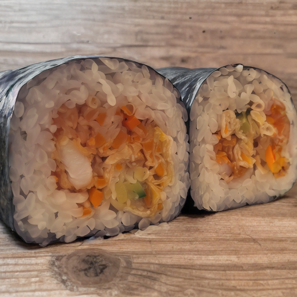 Rollo relelno de pepino, aguacate y queso crema. puedes agregar proteina extra y pedirlo empanizado. (costo extra)