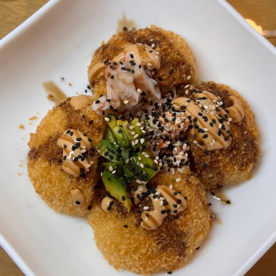 Bola de arroz empanizada, rellena de aguacate y la proteína a elegir, bañada de soya dulce, mayo chipotle y siracha,