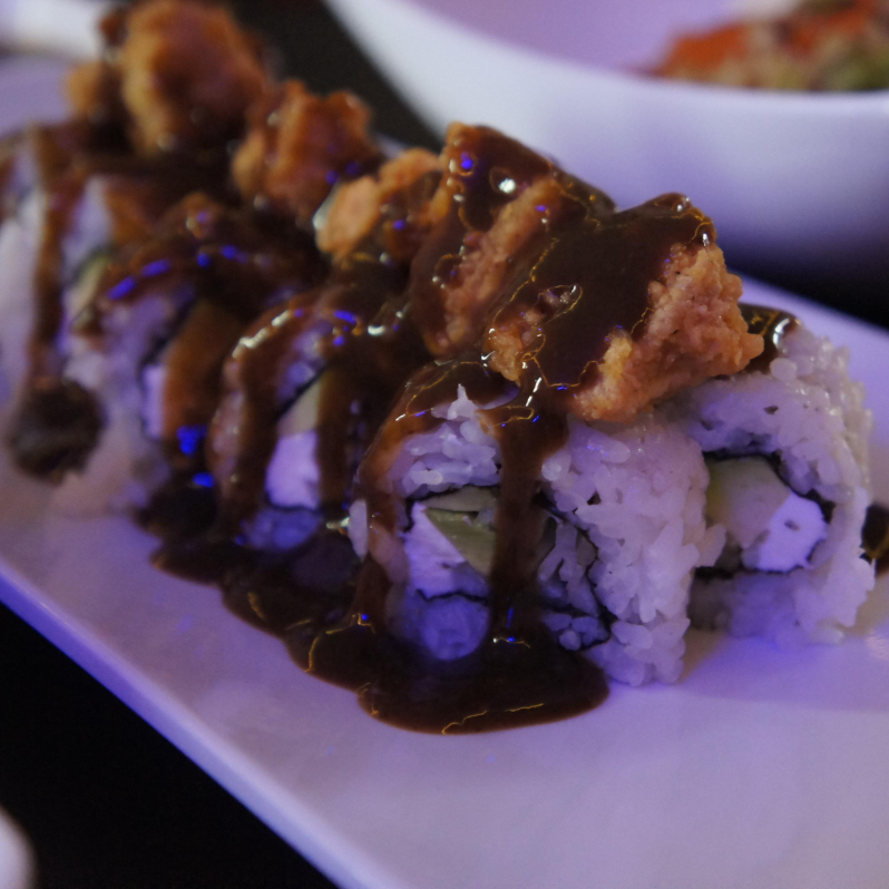 Rollo relleno de boneless, y aguacate. empanizado y bañado en salsa a eleccion.