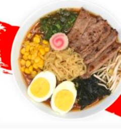 Caldo aromático con pasta, ramen, carne de cerdo, cebollín, huevo cocido, wakamen, naruto, germen de soya y elote.