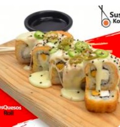 Envuelto en arroz empanizado, relleno de philadelphia y queso amarillo con queso manchego fundido, acompañado con rodajas de chiles toreados.