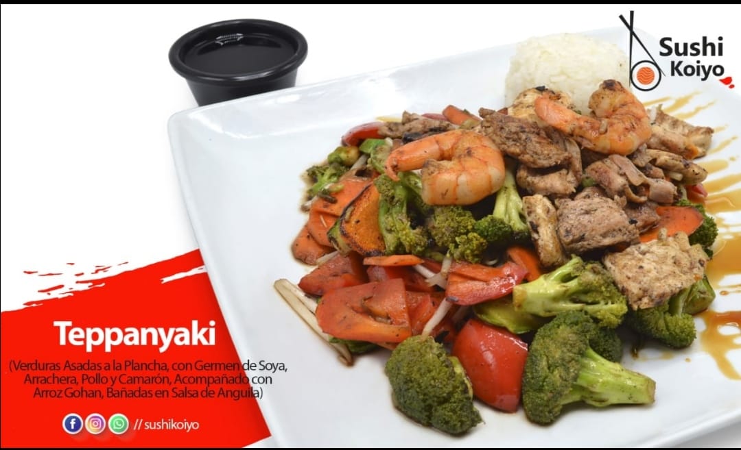 Pasta udon con verduras a la plancha, acompañado de arrachera, camarón y pollo sazonada con salsa a base de ajonjolí.