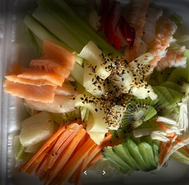 Lechuga, pepino, aguacate, camaron, pulpo, salmón, cangrejo, kiwi, mango y piña, y vinagreta especial (la fruta dpende por temporada)