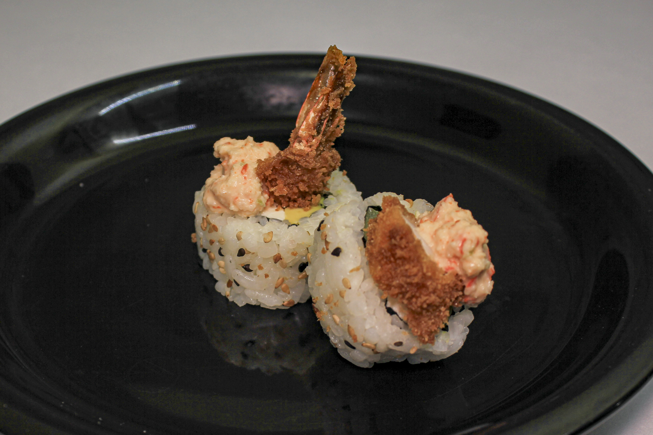 Sushi en molde, cubierto de salmón, cangrejo, camarón o mixto, relleno de queso crema, masago, aguacate y cubierto con ajonjolí.