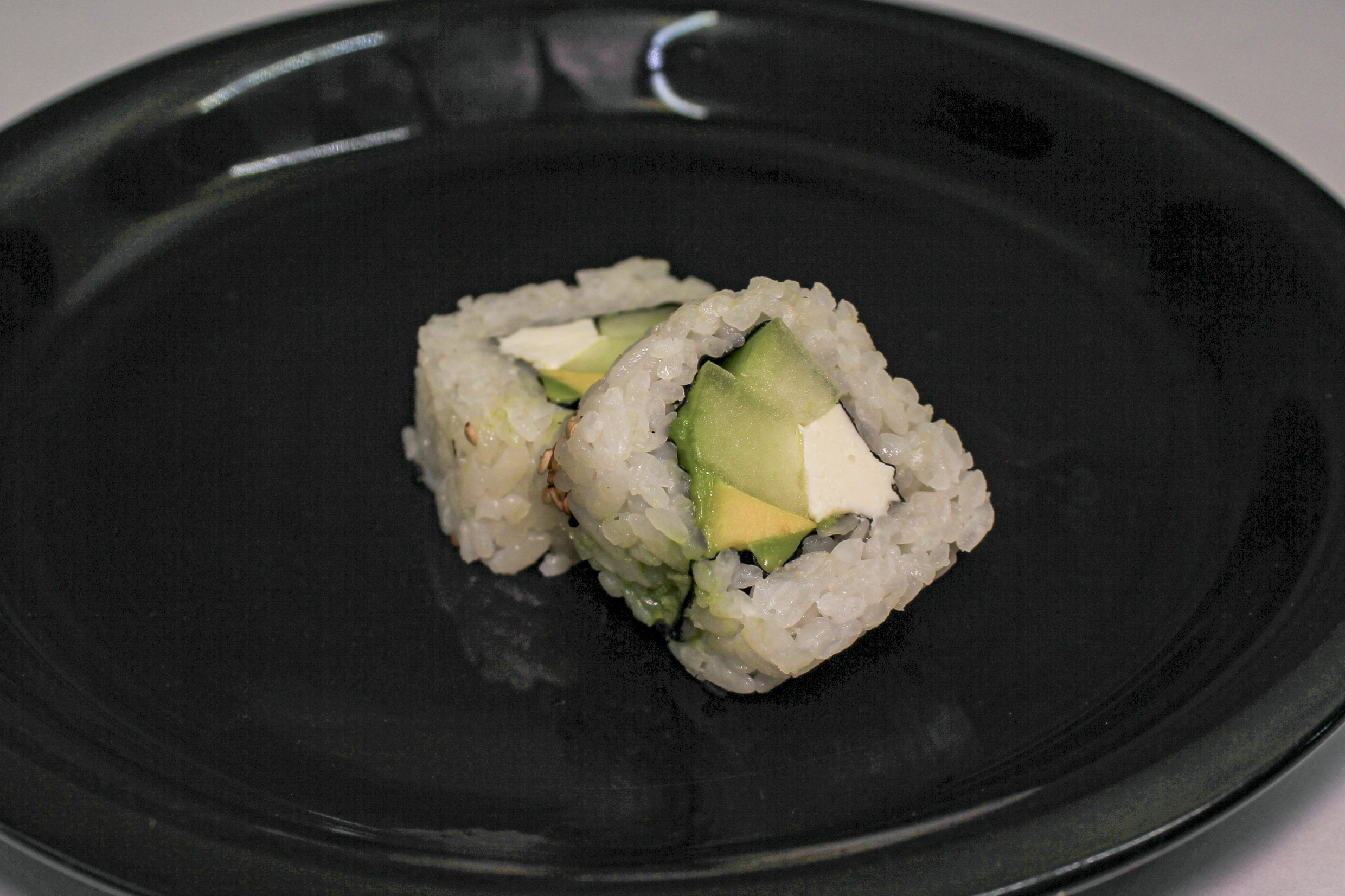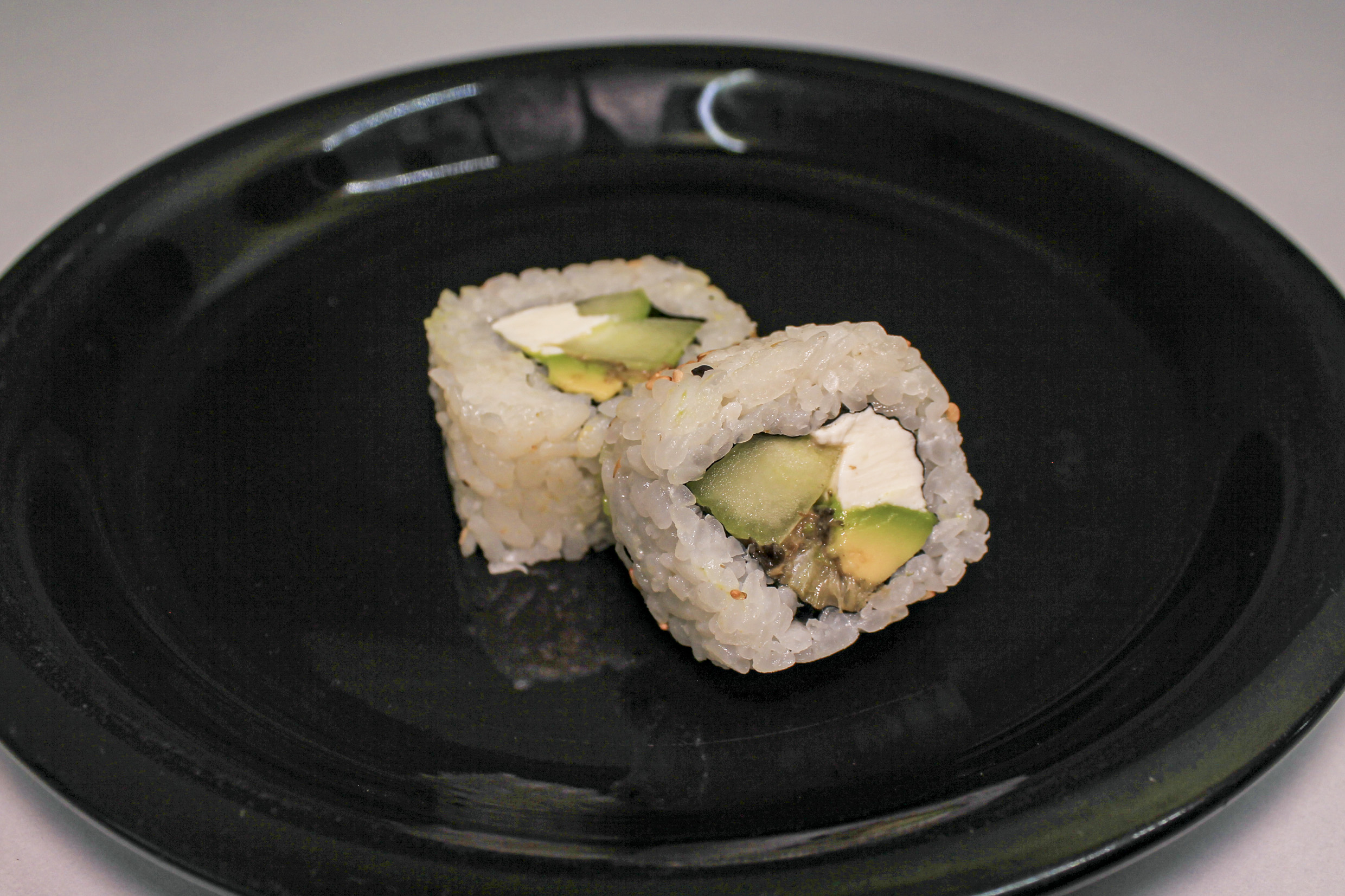 Envuelto de aguacate, relleno de queso crema, pepino y ajonjolí.