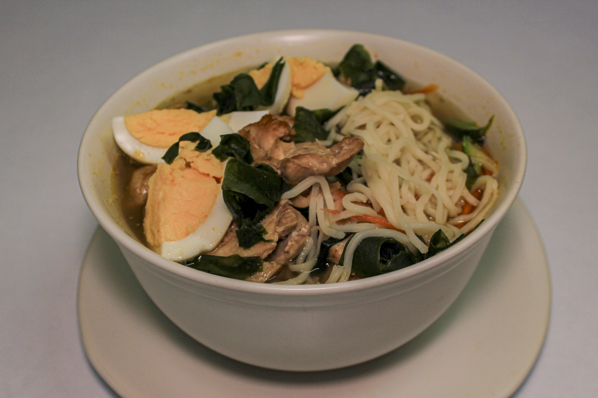 pasta ramen con pollo, 1 huevo cocido,naruto, champiñon,cebollin.