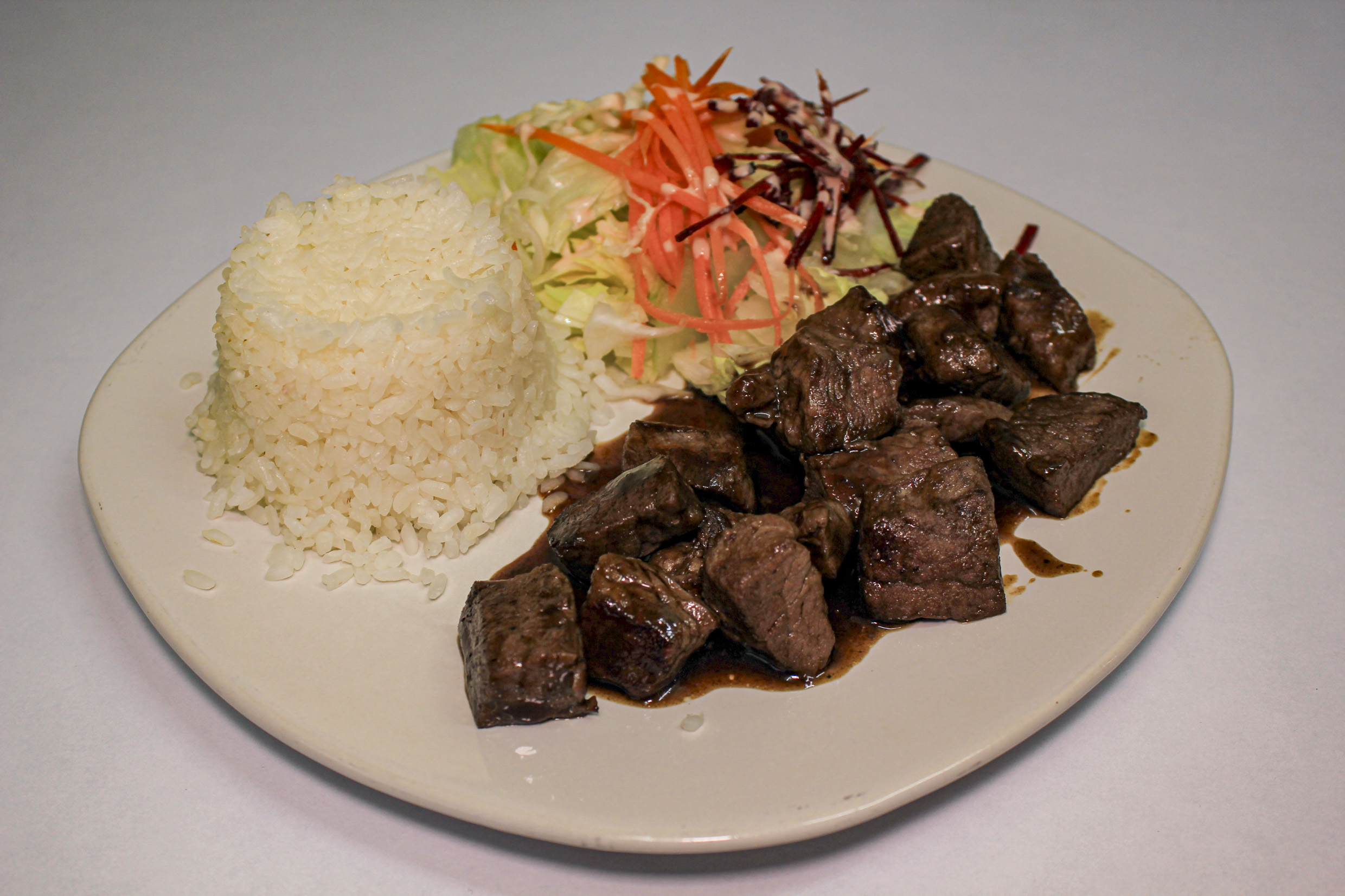 Filete de pescado adobado en salsa de jengibre, asado a la plancha, acompañado con arroz al vapor y ensalada fresca.