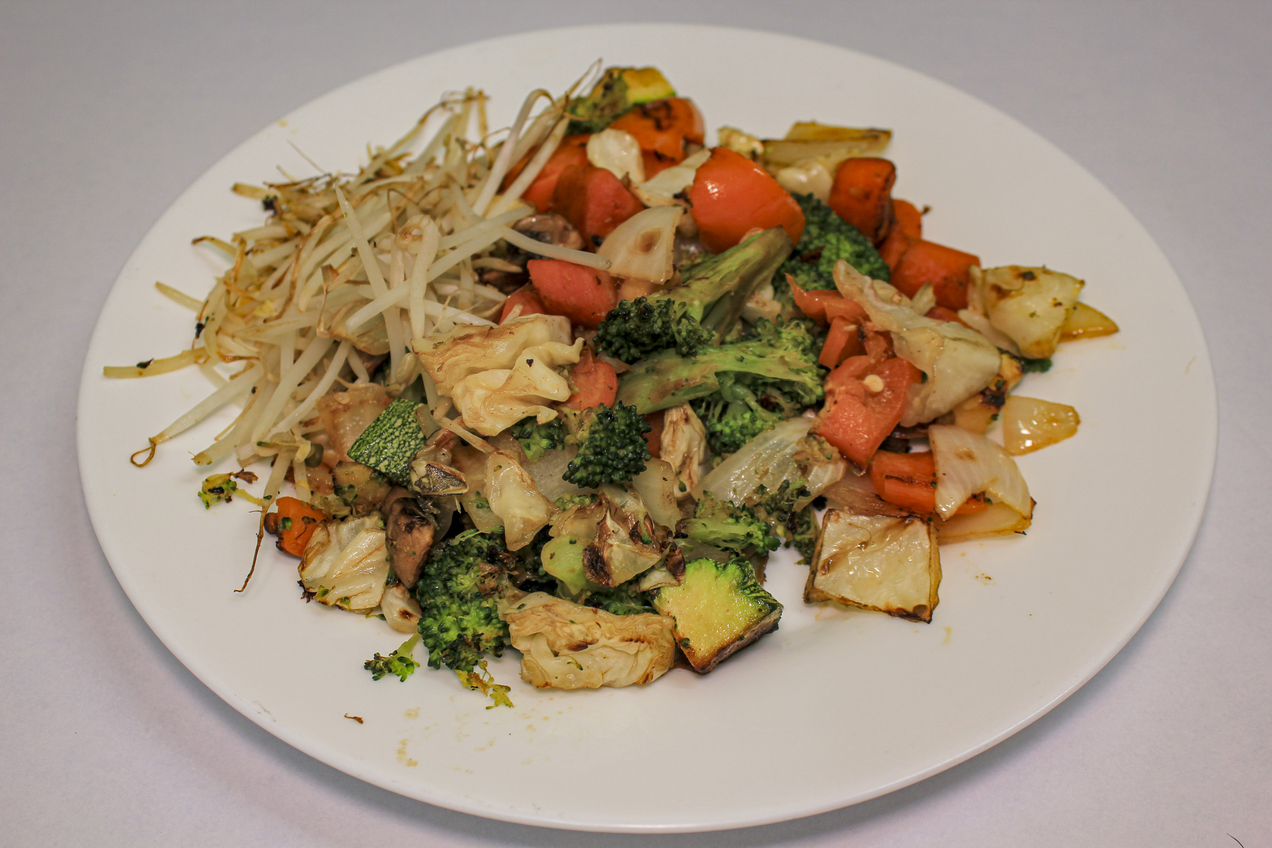 Verduras asadas con pollo, arroz con verduras, 2 giosas(rabiole japones).