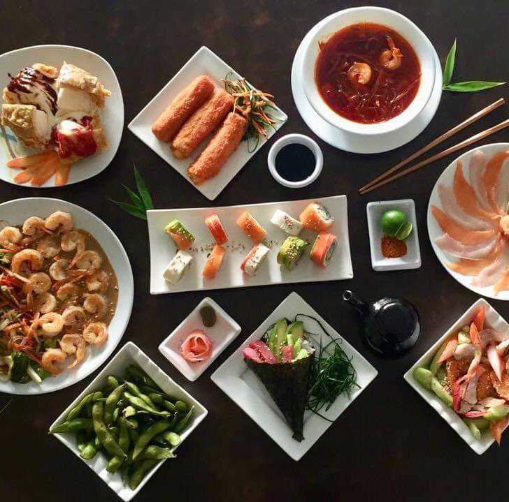 Arroz sazonado, a la plancha, con verduras, camarón, pollo, res, queso crema, aguacate y tampico.