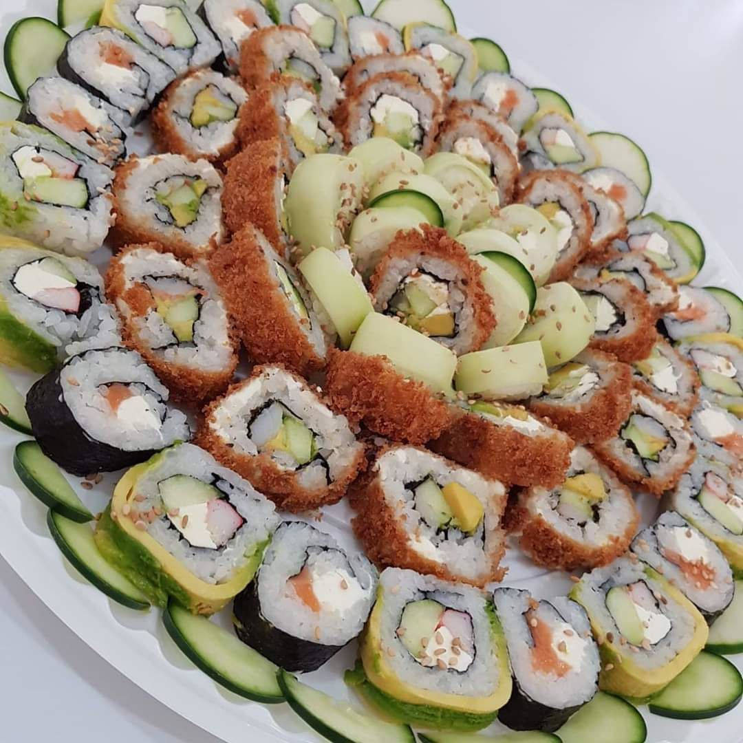Preparados con algas marinas y partidos en 10 piezas. Cubierto de salmón, cangrejo, queso, aguacate, relleno de camarón, pepino y aguacate con ajonjolí.