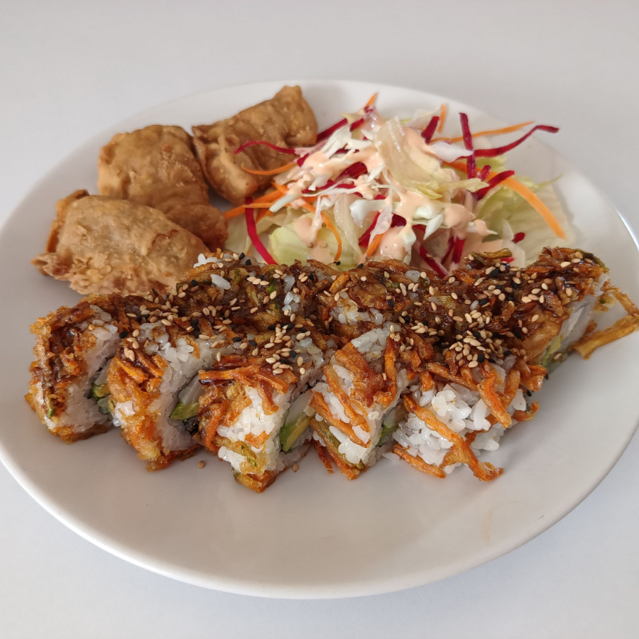 Kakeague maki, giosas 3 pzas, ensalada verduras fresca con adereso.