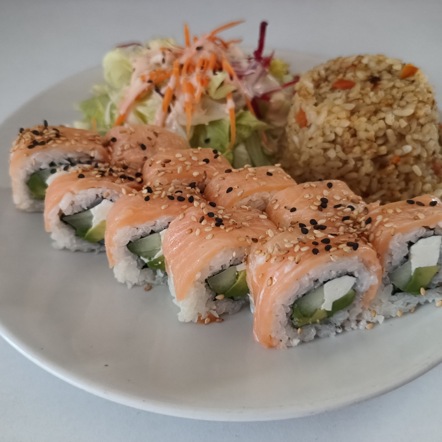 Preparados con algas marinas y partidos en 10 piezas. Cubierto de salmón, relleno de aguacate, queso crema y pepino con ajonjolí.