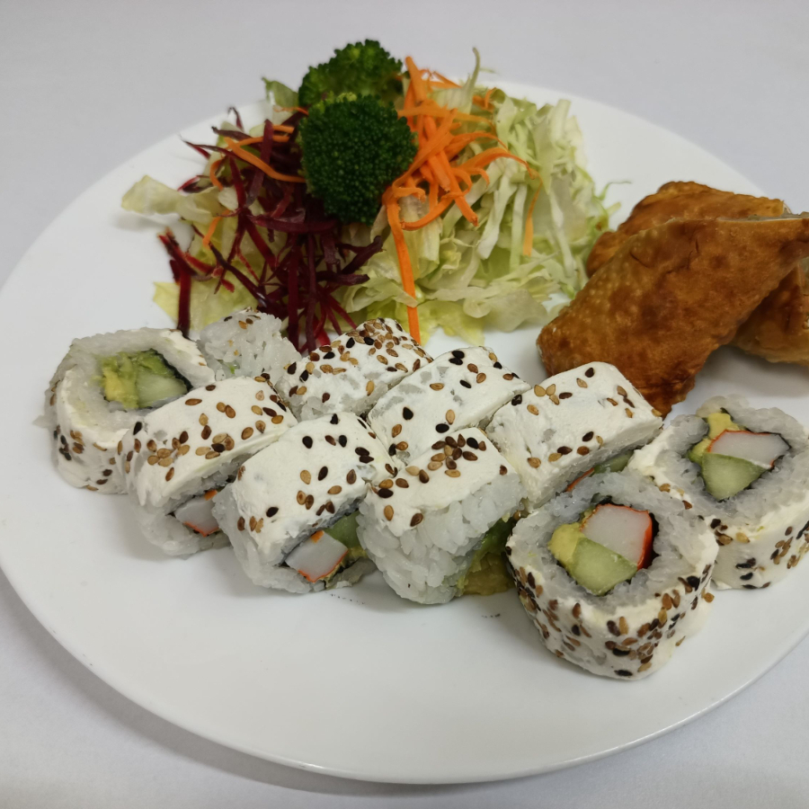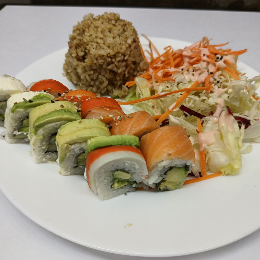 6 BOCADO SUSHI SALMON, ARROZ VEGETARIANO,2 BROCHETAS DE PLATANO EMPANIZADO,,ENSALADA VEGETALES.