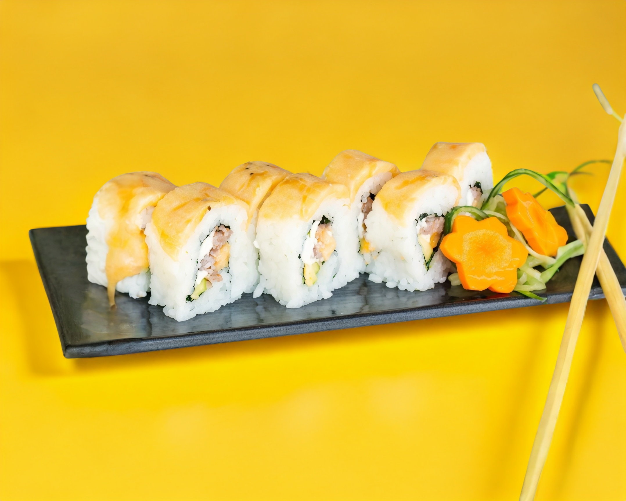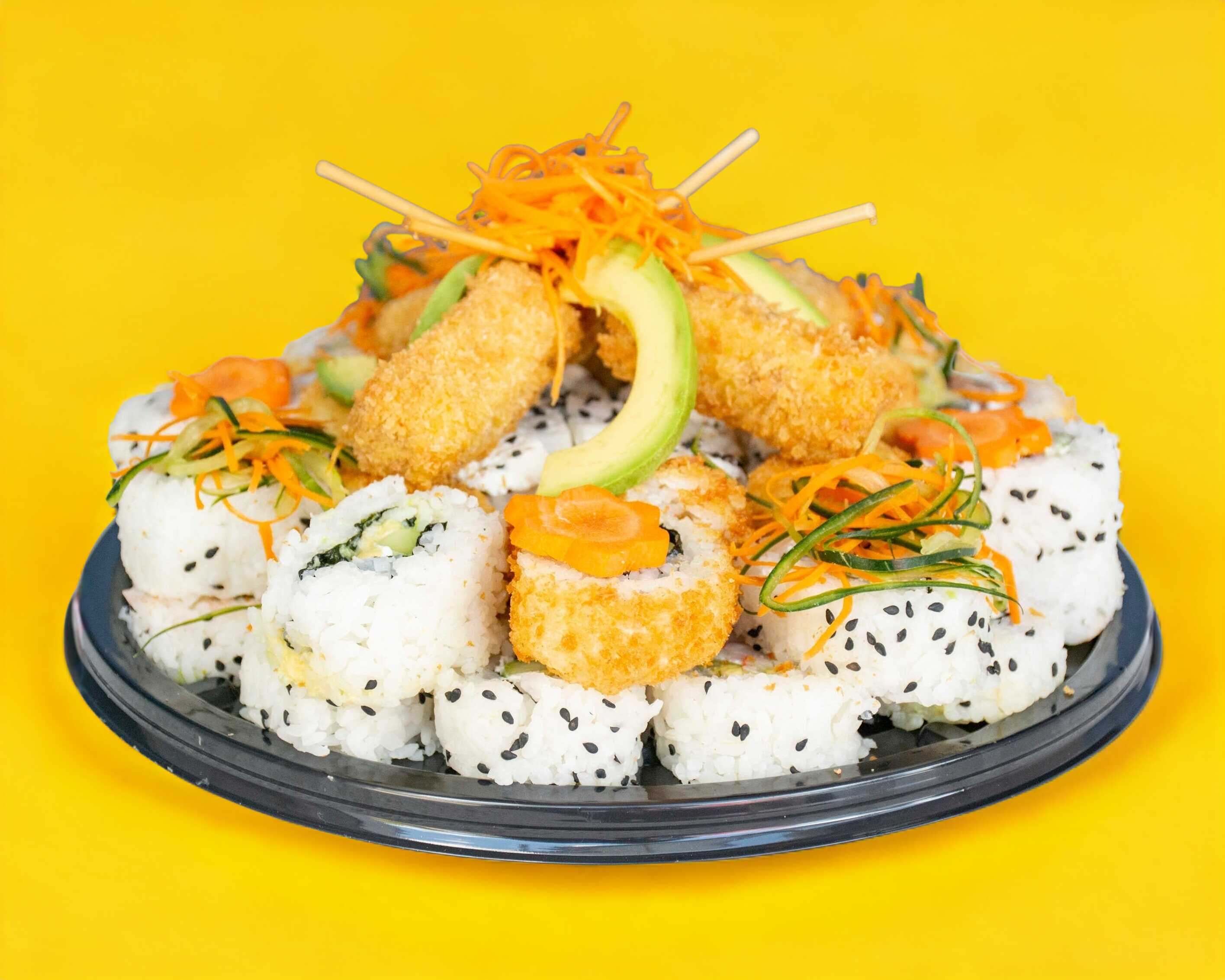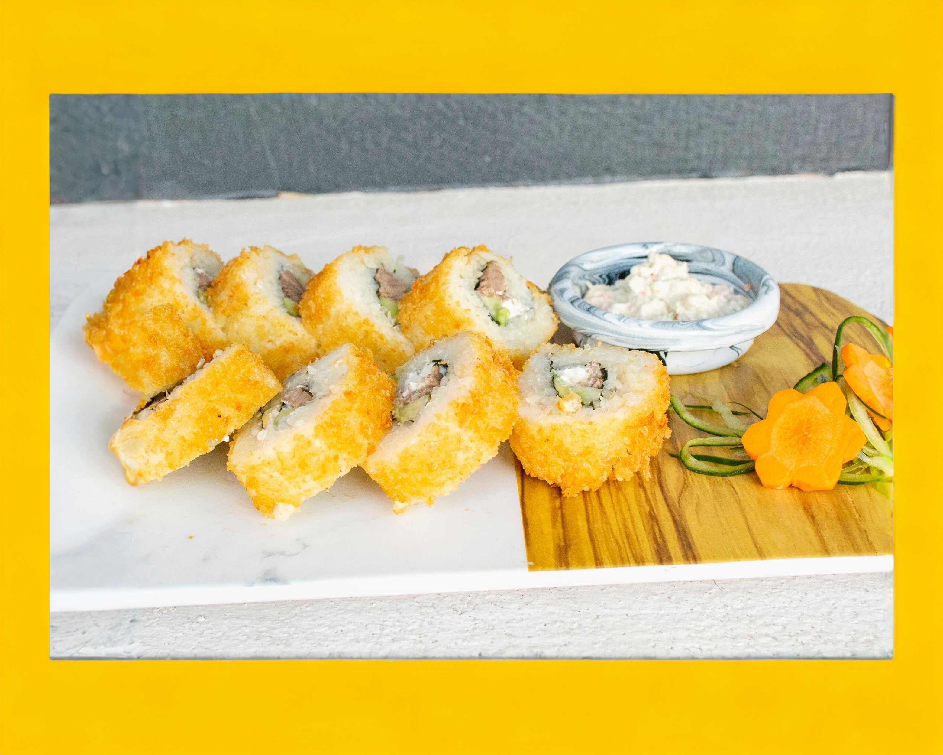 Por dentro: Yakimeshi, pollo, aguacate, queso crema. Por fuera: Empanizado con salsa chipotle.