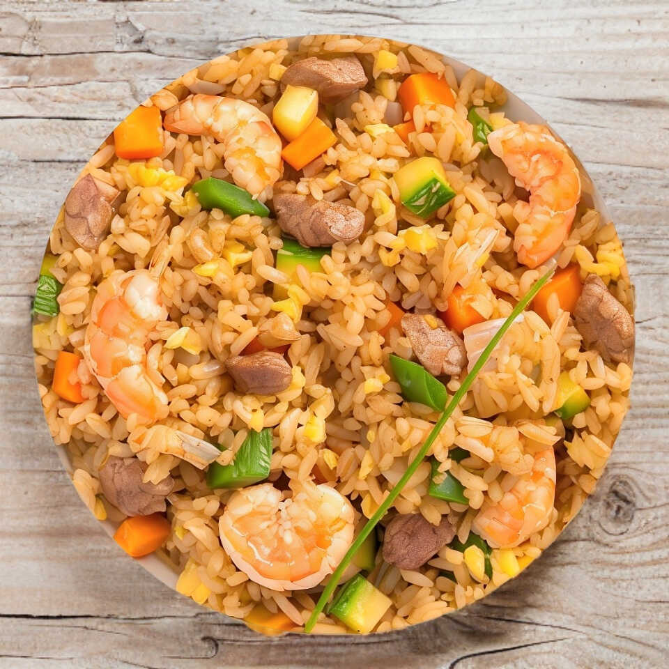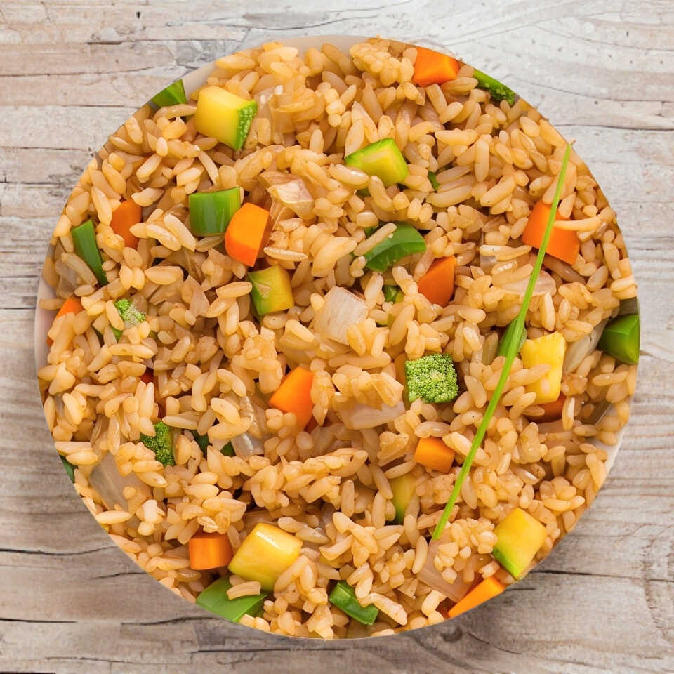 Arroz frito con huevo, calabza, zanahoria y cebolla.