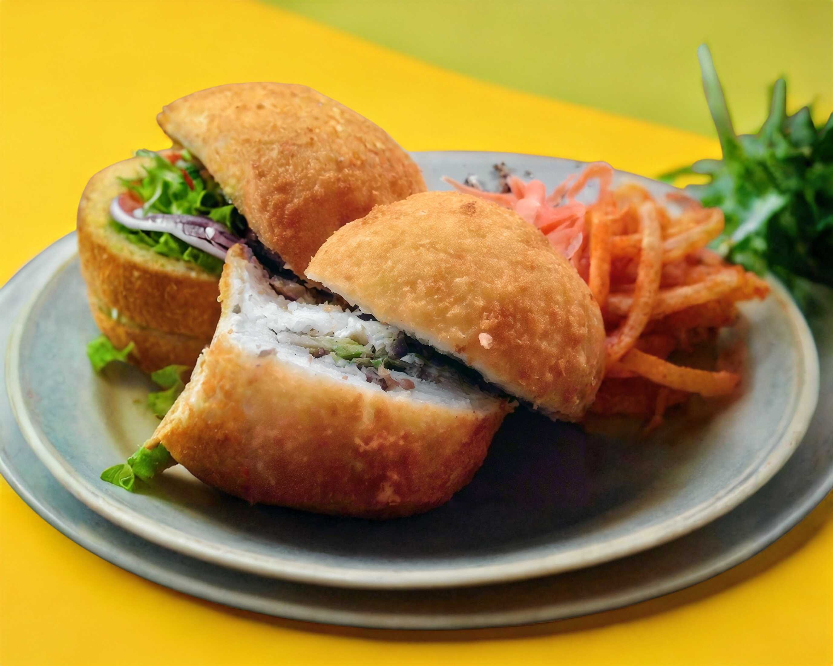 Por dentro: Plátano macho, queso crema, arrachera aguacate. Por fuera: Tapizado de plátano macho.