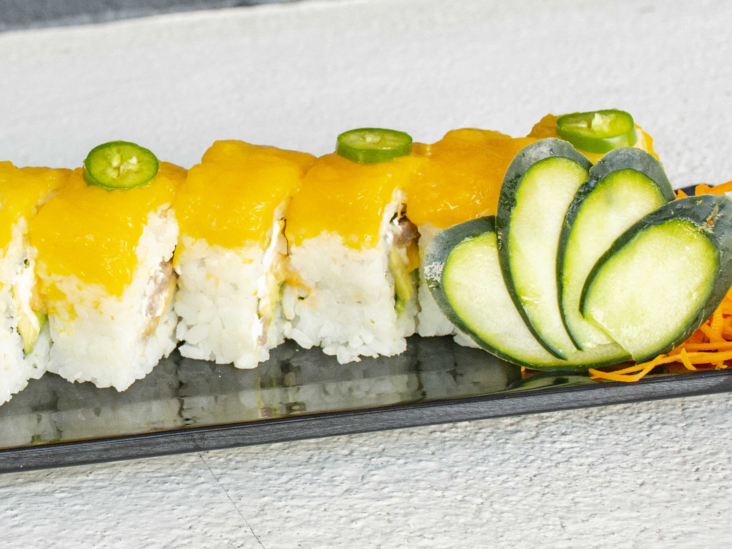 Por dentro: Res, aguacate, queso crema, por fuera tapizado de mango y aderezo chipotle.