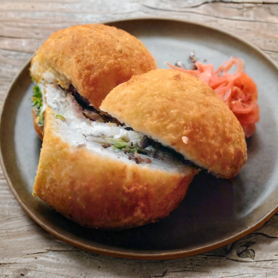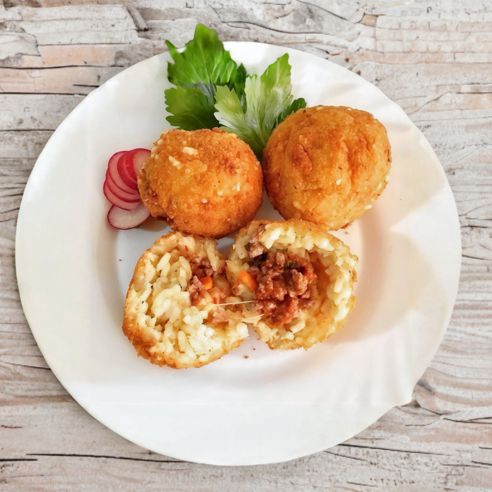 Bola de arroz empanizada rellena de aguacate, queso crema y pepino.