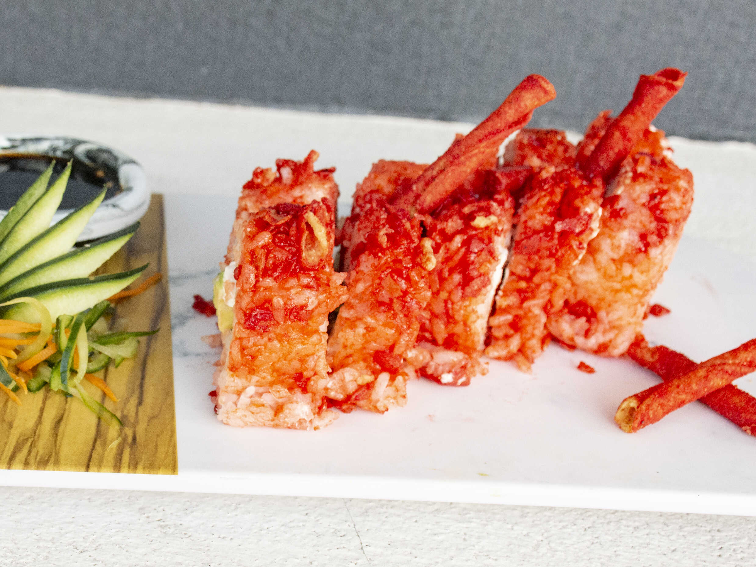 Por dentro: camarón empanizado relleno de queso crema , aguacate, pepino. por fuera: tapizado de takis acompañado de chipotle.