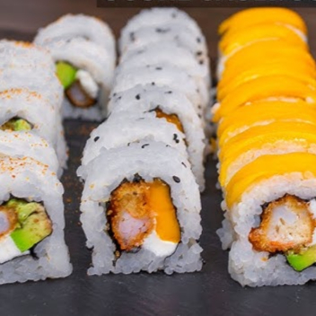 Por dentro: cangrejo, queso crema y aguacate Por fuera: pepino, camaron roca, salsa tampico y anguila