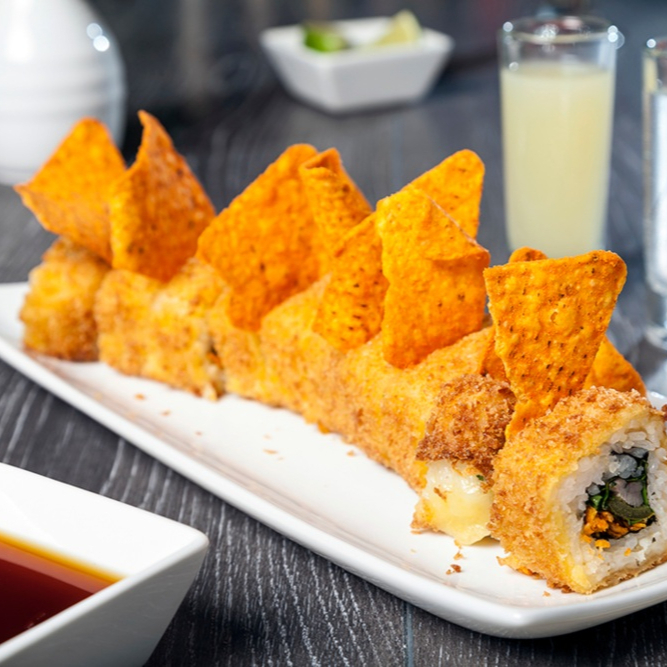 Por dentro: queso crema, aguacate y camaron por fuera: doritos chipotle y tampico