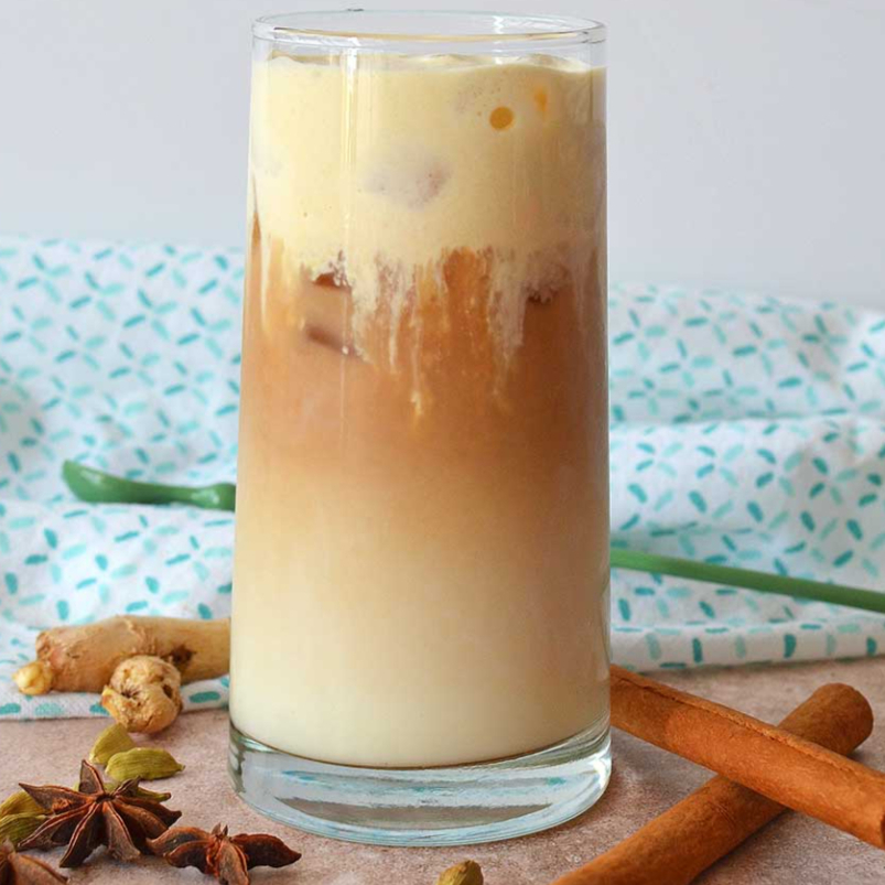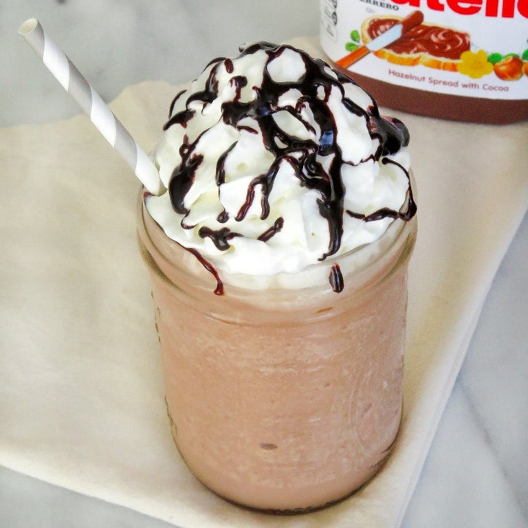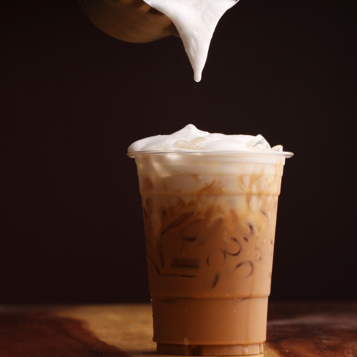 Leche, hielo, chocolate, café, azúcar, crema batida, jarabe de chocolate