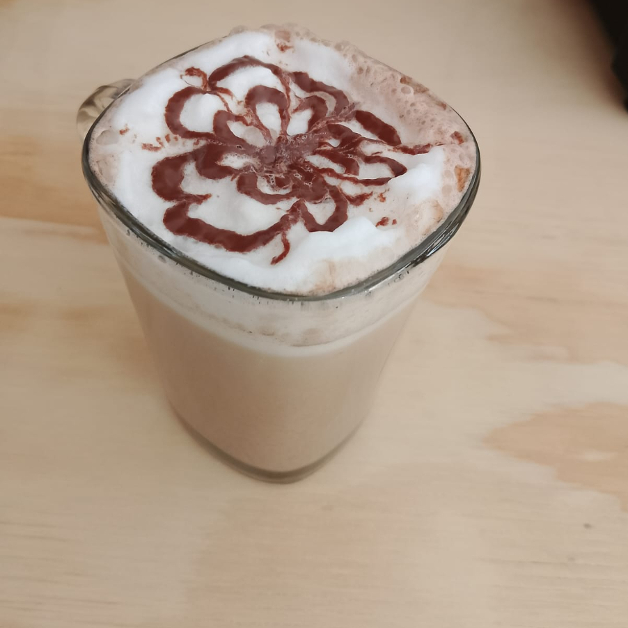 Hielo, cocoa, azucar, vainilla, leche, crema batida, jarabe de chocolate