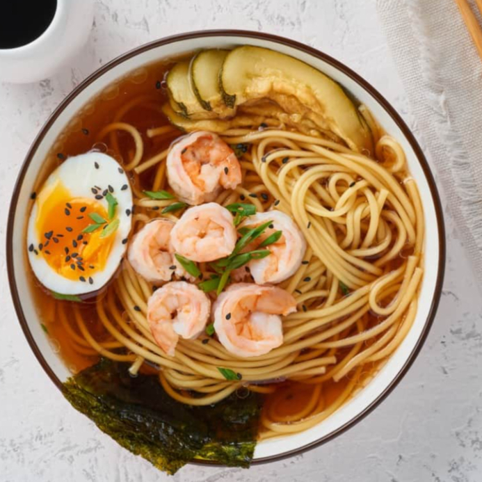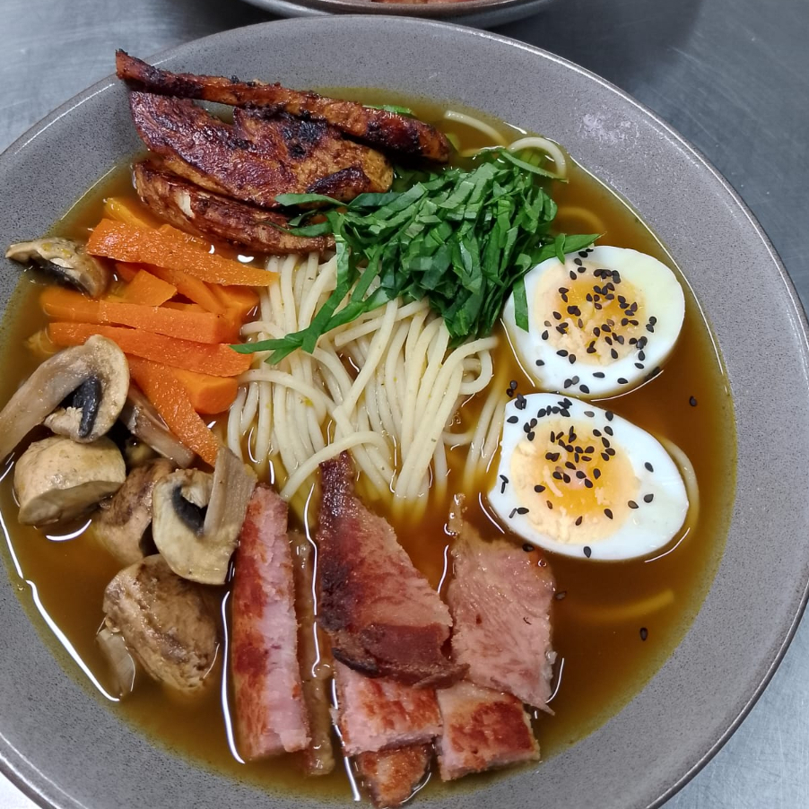 Fideos ramen hechos en un fondo especial acompañado de verduras, alga,huevo, camaron, res y pollo