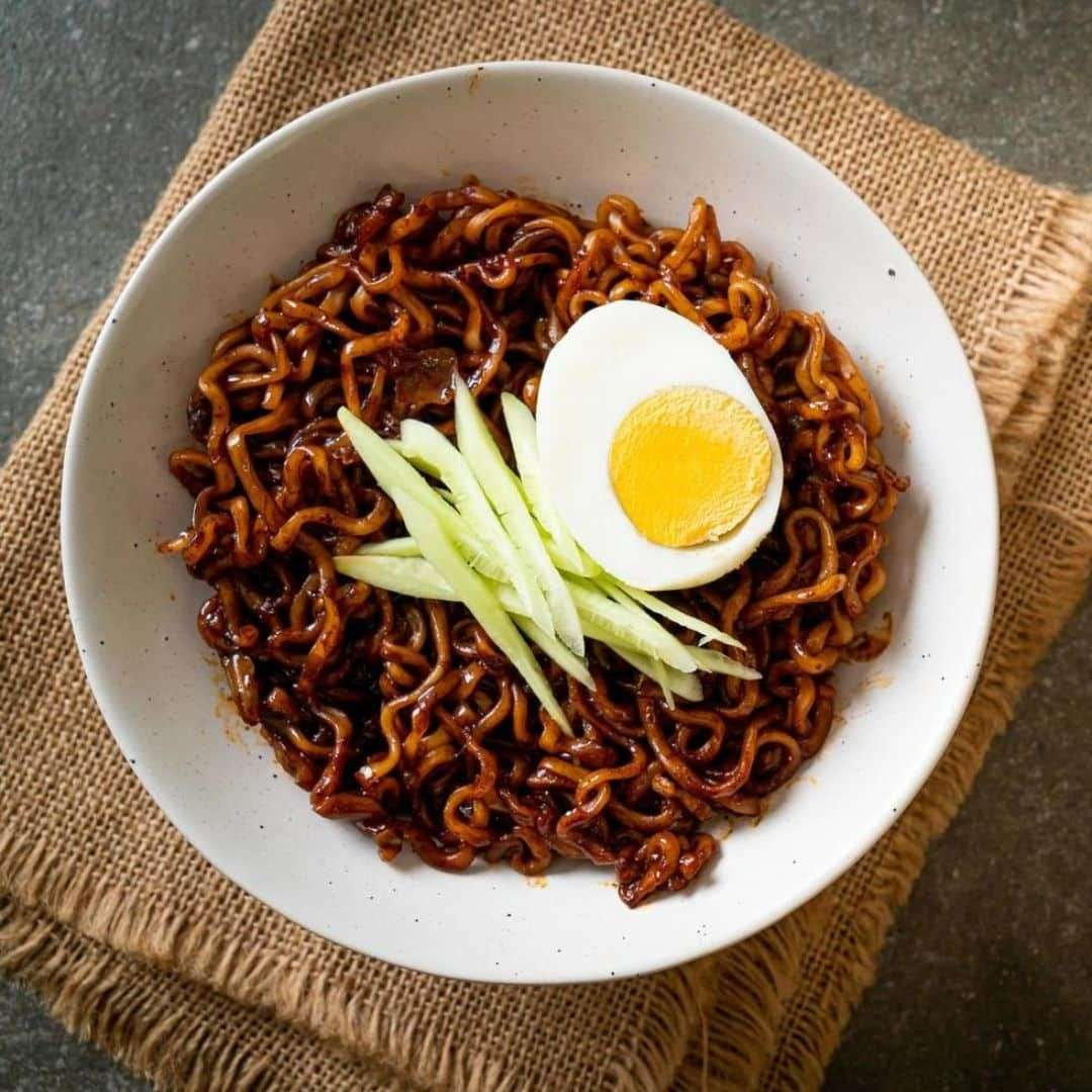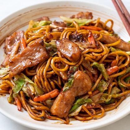 Fideos salteados con verduras, cerdo y salsa negra, picante, muy picante, o habanero especial