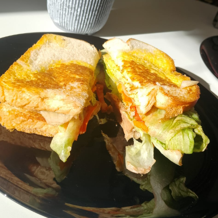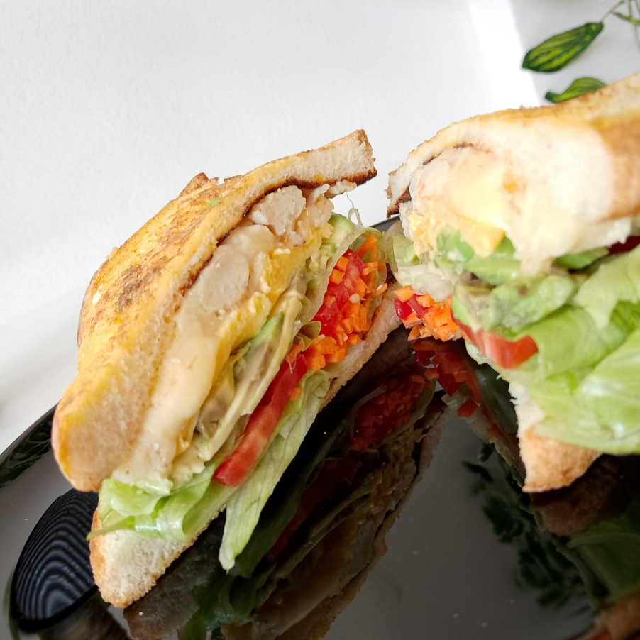 Pan barnizado con huevo relleno de lechuga, zanahoria y jitomate con 1 huevo, queso y pollo