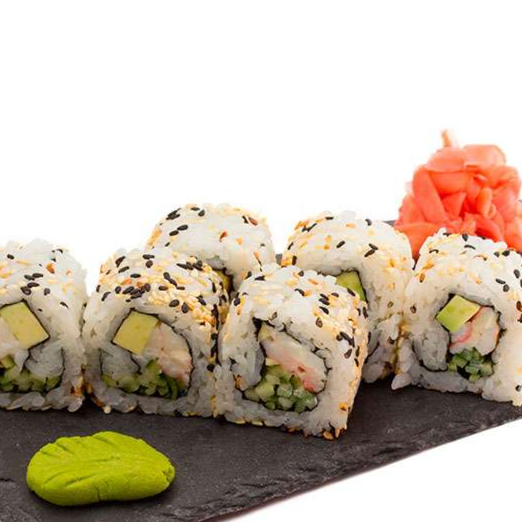Por dentro: queso crema, aguacate y pepino Por fuera: camaron y salsa tampico