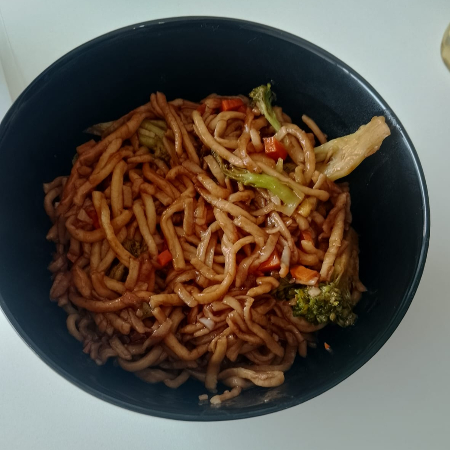 Fideos salteados con verduras y salsa negra, picante, muy picante, o habanero especial